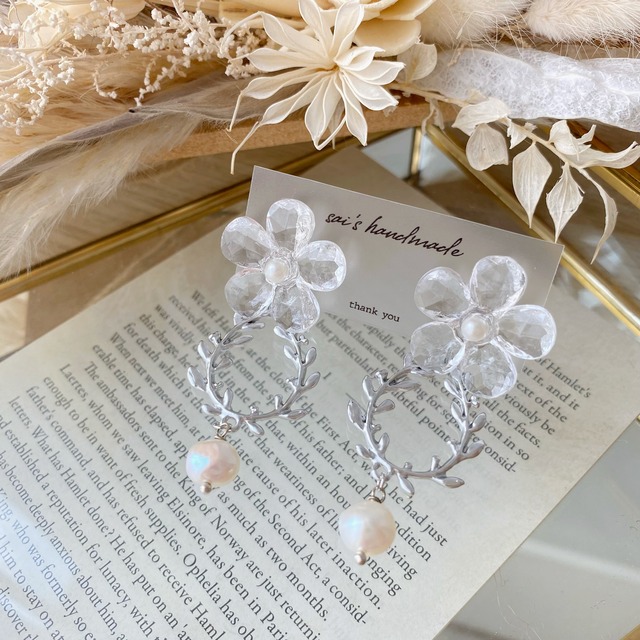 クリアフラワーとボタニカルチャームの2wayピアスです⚮̈ .゜ 気分や服装によってチャームの付け外しが出来ます( ⁎ᵕᴗᵕ⁎ ) 全長:約6cm(ピアスの場合) 重さ:約8g ✔︎金具 ピアス(写真通り)▶︎プラス料金なし 樹脂ピアス▶︎+100円 チタンピアス▶︎+100円 ネジバネイヤリング▶︎+100円 樹脂ノンホールイヤリング▶︎+100円 (イヤリングでも2way可能ですが少しデザインが変わりますので気になる方は事前にご相談ください♡) ✍︎変更希望の方は"金具変更ページ"よりご希望の金具をカートに追加してくださいませ( ⁎ᵕᴗᵕ⁎ ) ✔︎1つ1つ丁寧に作成していますが 海外製パーツを使用した、 素人のハンドメイド作品になりますので 完璧なものをお求めの方はご遠慮くださいませ。