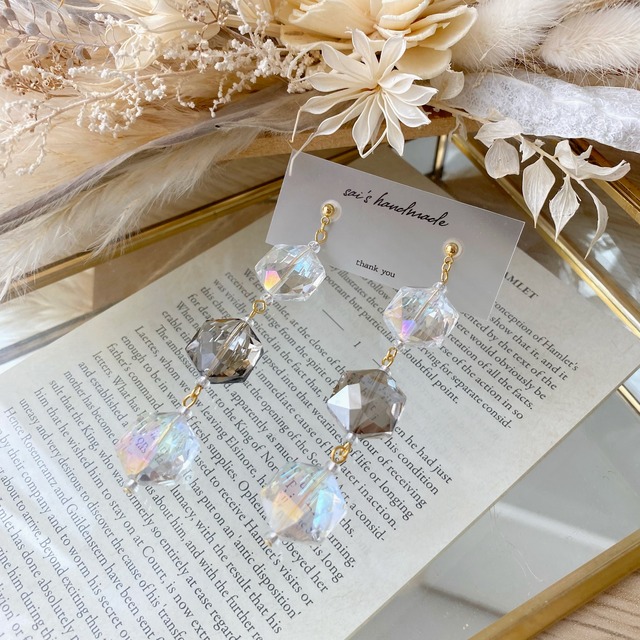 オーロラカットガラスの3連ピアス*∗ ◌ 光に当たるとキラキラします⸝⸝⸝ ✧︎ 全長:約7.5cm 重さ:約12g ✔︎金具 ピアス(写真通り)▶︎プラス料金なし 樹脂ピアス▶︎+100円 チタンピアス▶︎+100円 クリップイヤリング▶︎+100円 ネジバネイヤリング▶︎+100円 フープイヤリング▶︎+100円 ✍︎変更希望の方は"金具変更ページ"よりご希望の金具をカートに追加してくださいませ( ⁎ᵕᴗᵕ⁎ ) ✔︎1つ1つ丁寧に作成していますが 海外製パーツを使用した、 素人のハンドメイド作品になりますので 完璧なものをお求めの方はご遠慮くださいませ。