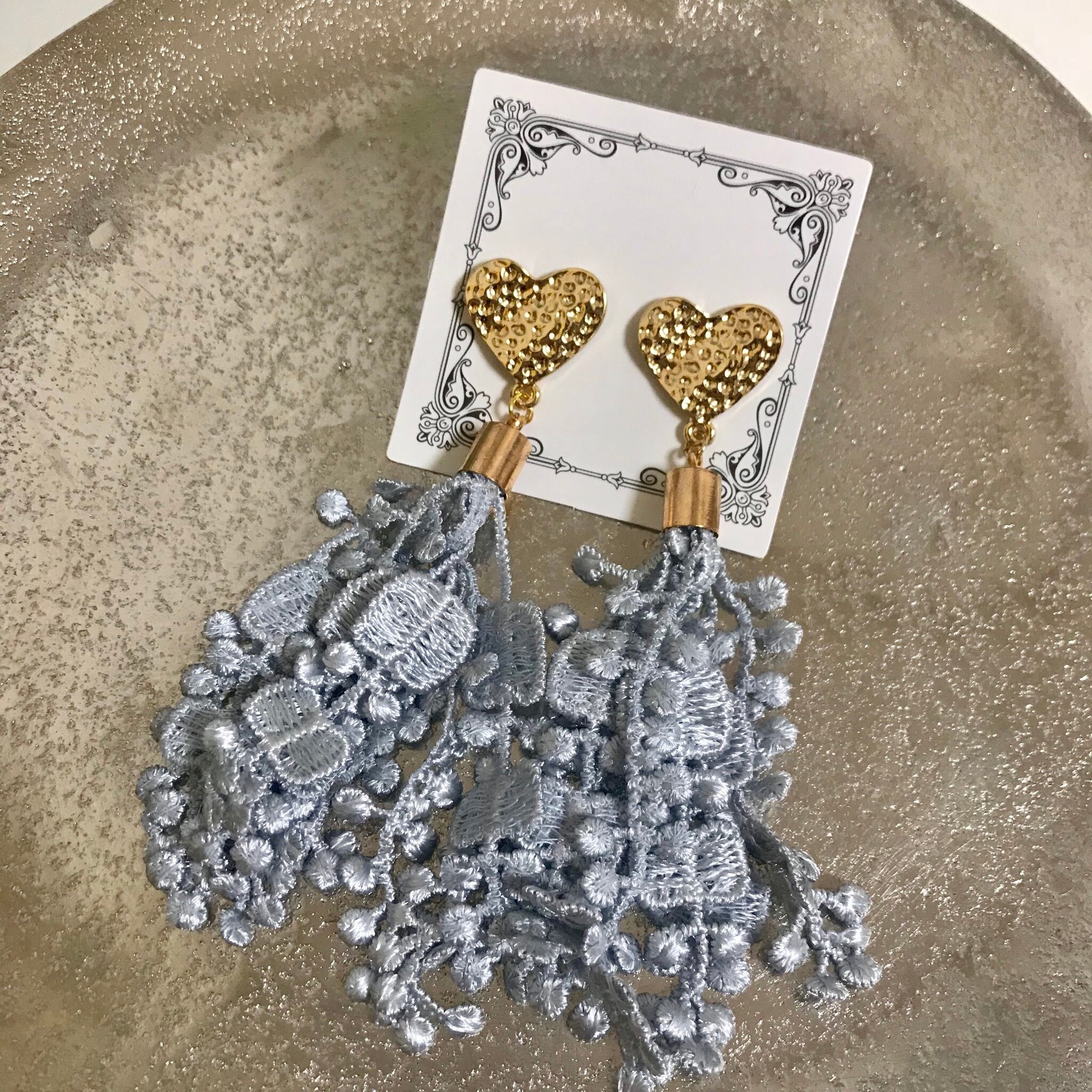 ハートのポストピアスに春らしいレースタッセルを合わせました( ¨̮ )*
