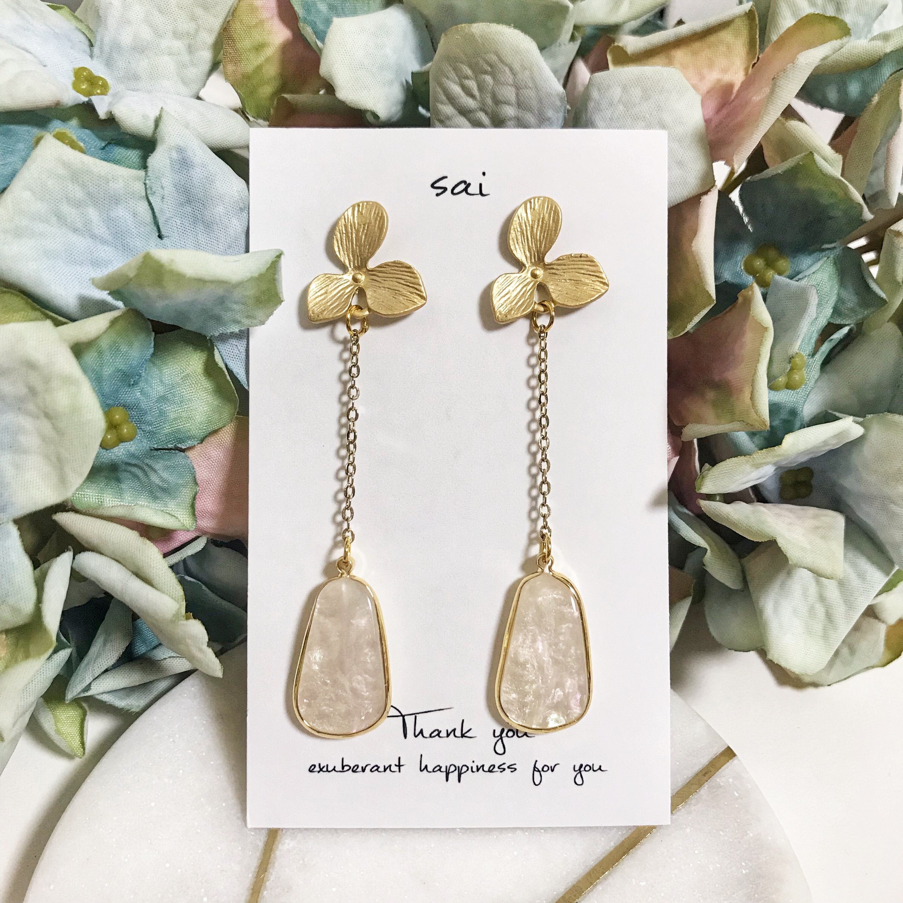 ゴールドのお花のポストピアスに、華奢なチェーン、シェルパーツを合わせました^^