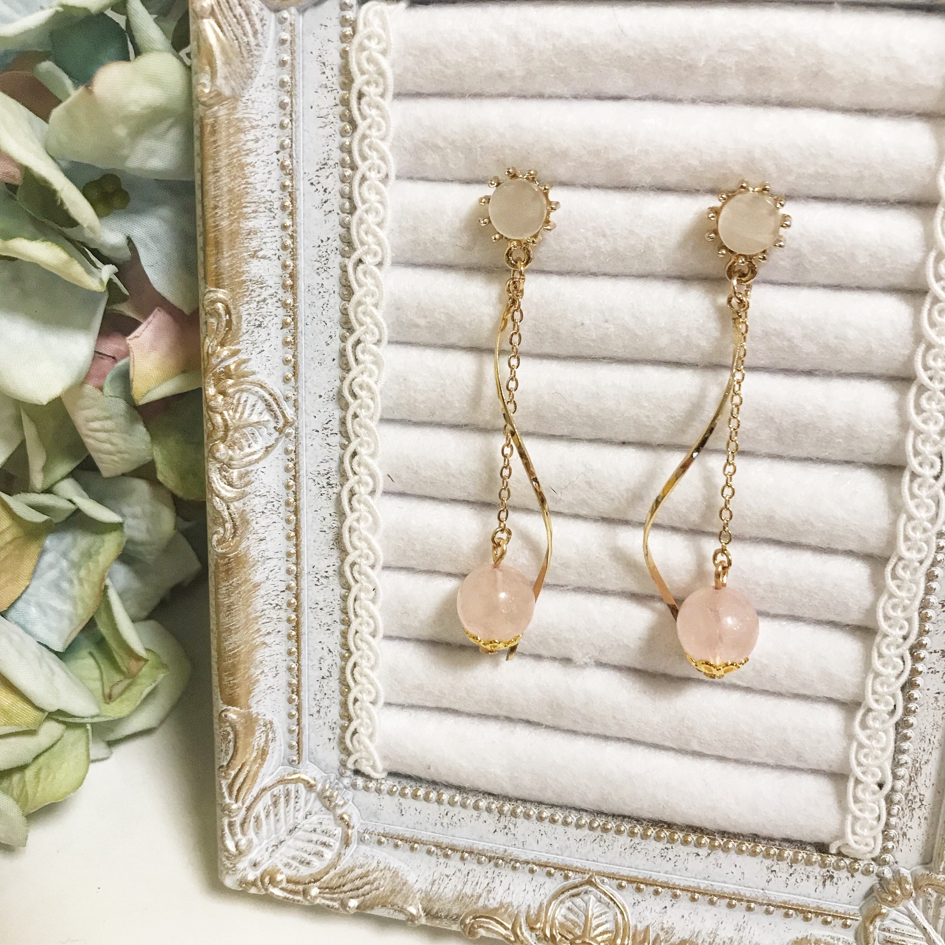天然石を華奢なゴールドチェーンで繋ぎ、ウェーブのチャームを合わせたロングピアス/イヤリングです☺︎