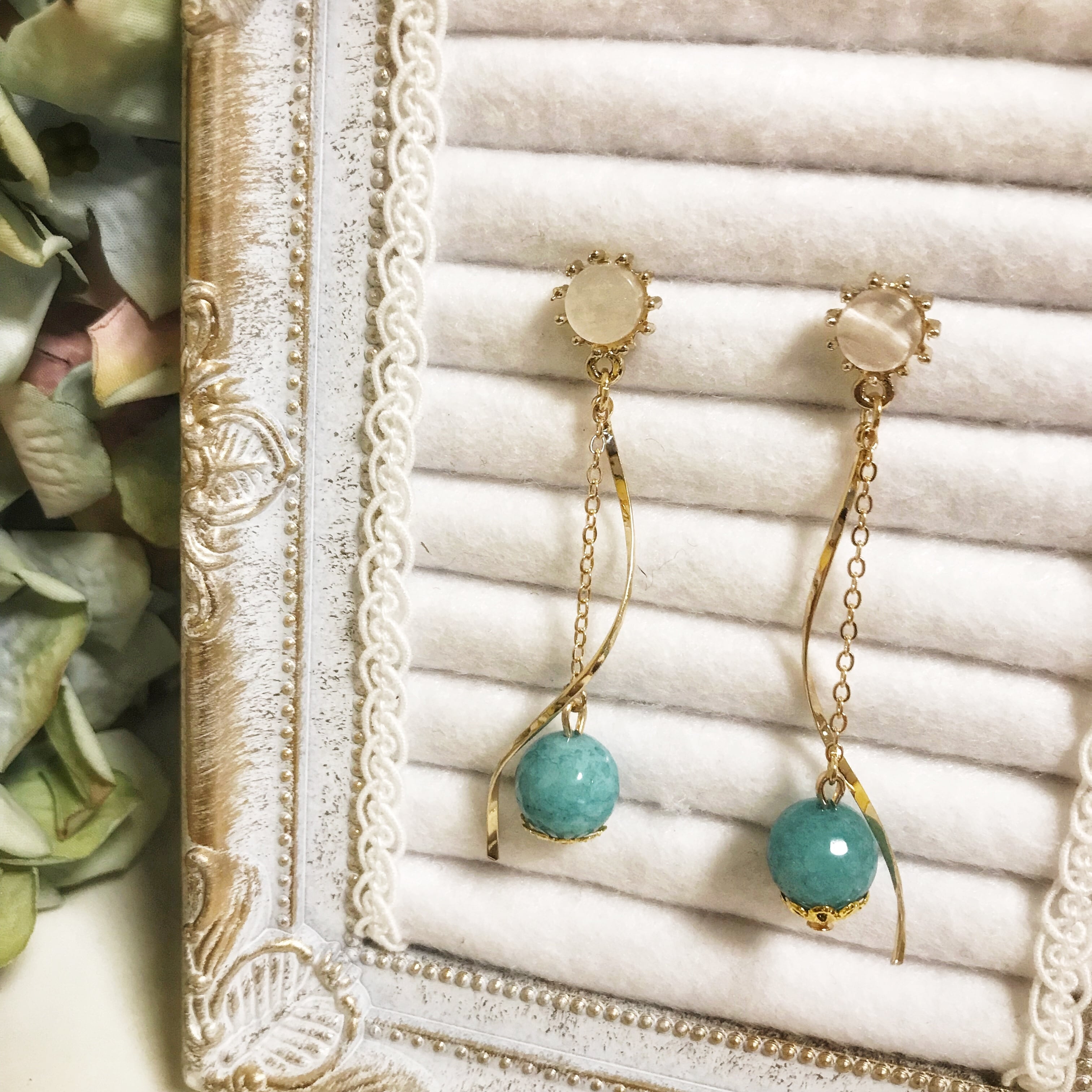 天然石を華奢なゴールドチェーンで繋ぎ、ウェーブのチャームを合わせたロングピアス/イヤリングです☺︎