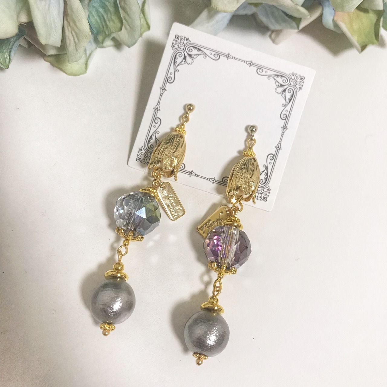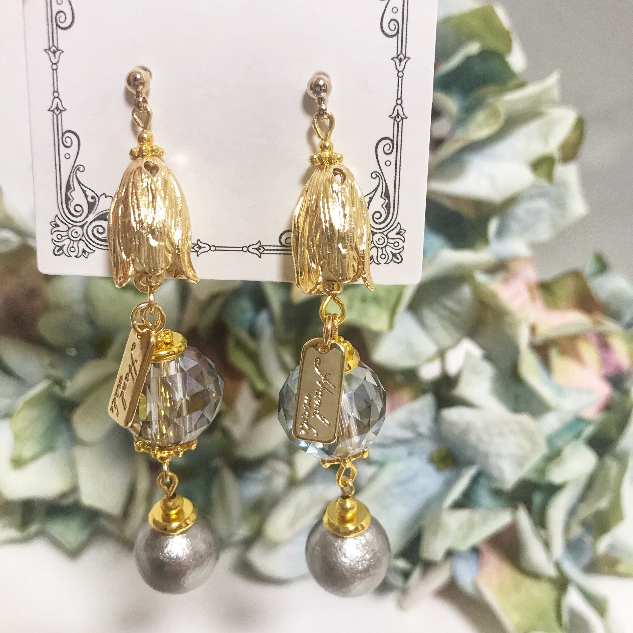 ゴールドの蕾にダブルフェイスのカットガラス、コットンパールを合わせました( ¨̮ )*