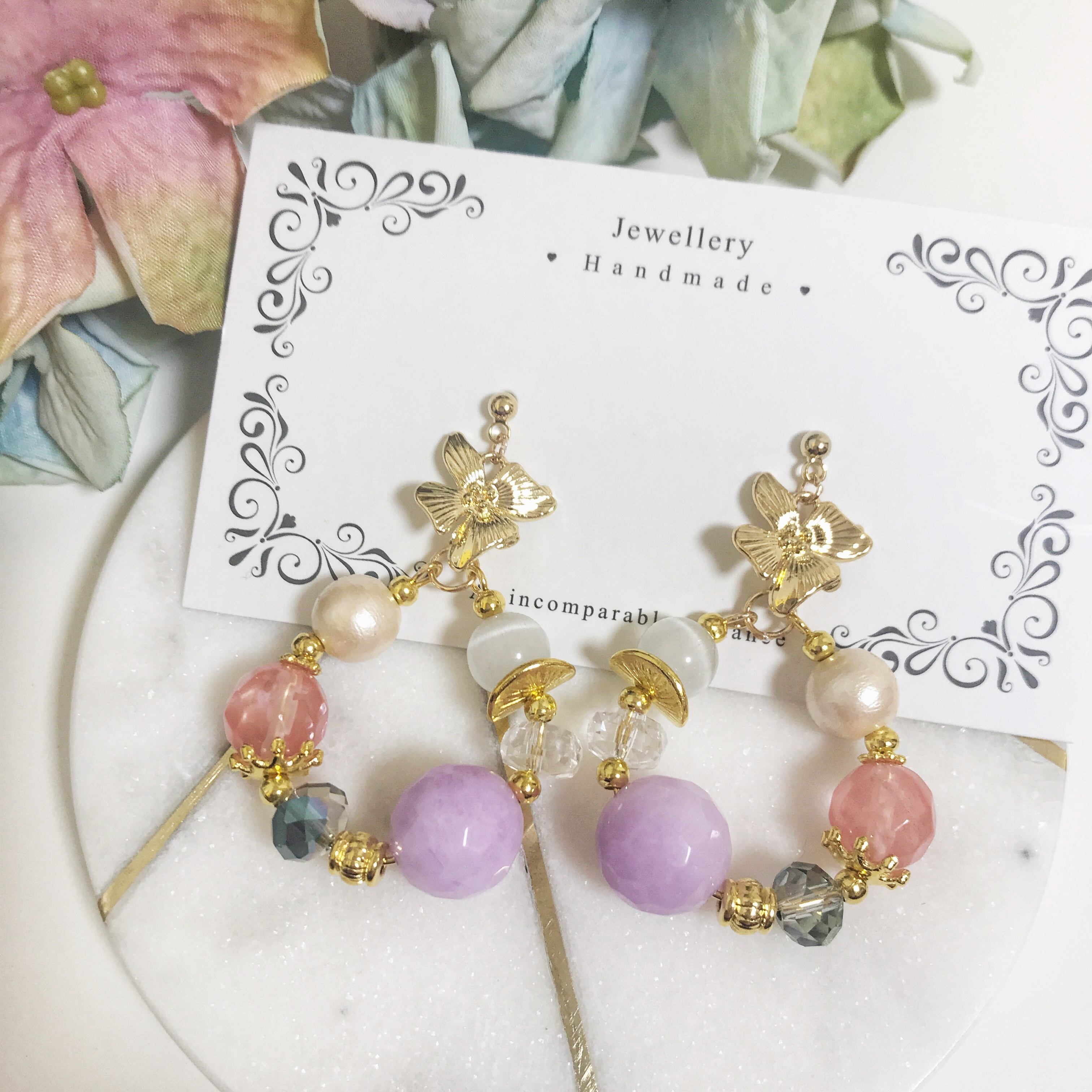 お花チャームに天然石ラベンダージェイド&チェリークォーツ&ホワイトキャッツアイでパステルカラーの可愛い感じに( ¨̮ )*