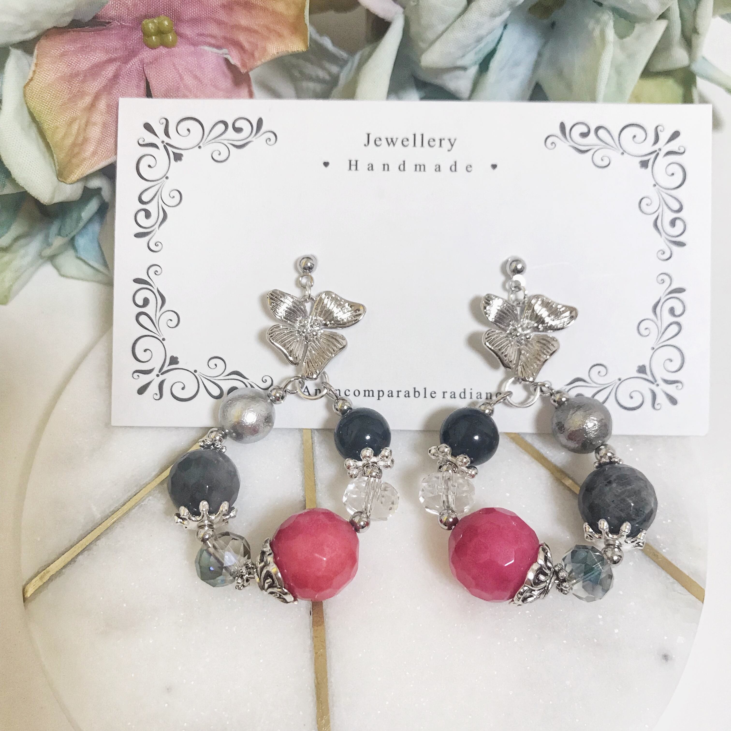 お花のチャームに天然石ブラックラブラドライト&オニキス&ジェードチェリーピンクで大人かわいい感じに( ¨̮ )*