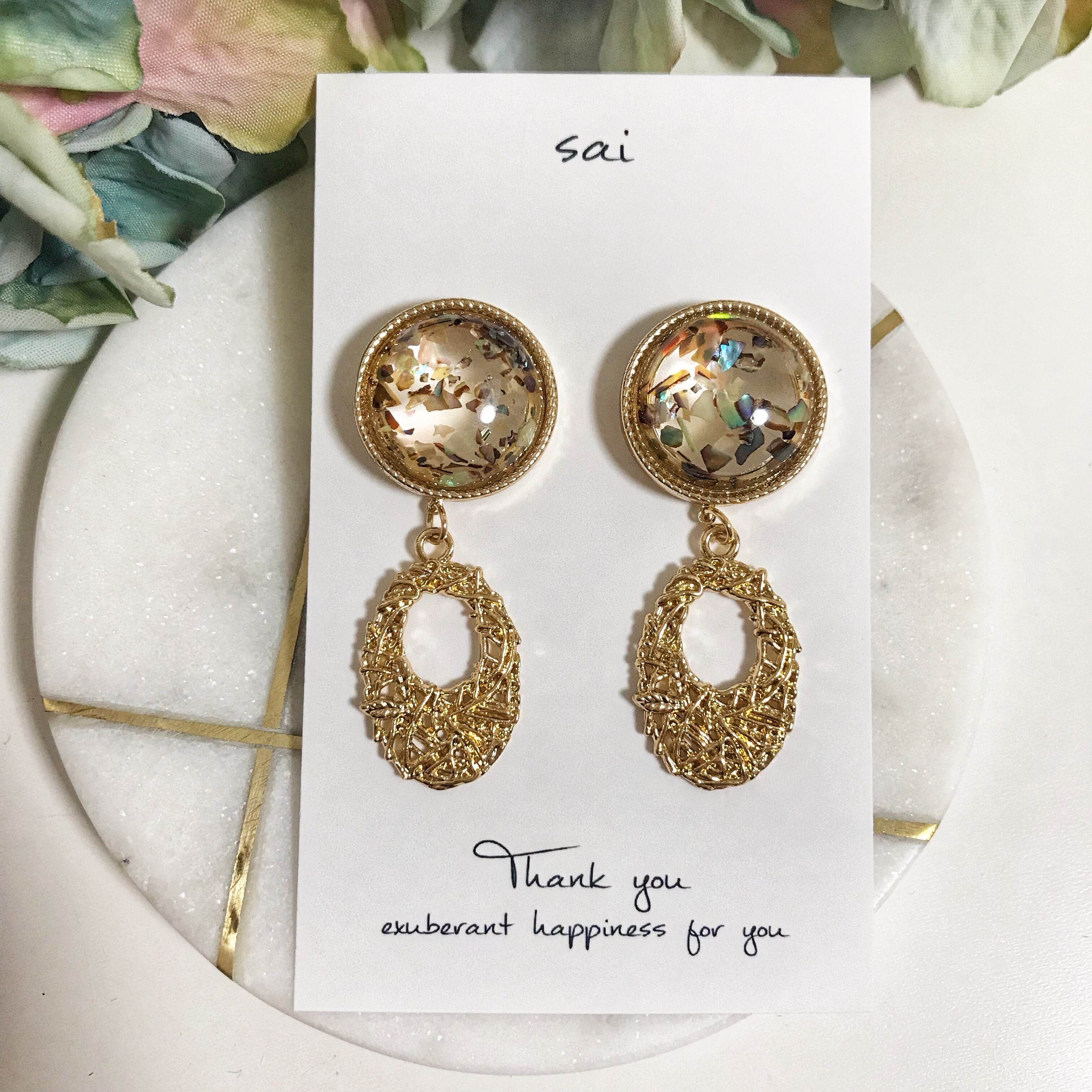 シェルフレークを埋め込んだクリアピアスに透かしのオーバルチャームを合わせました( ¨̮ )*