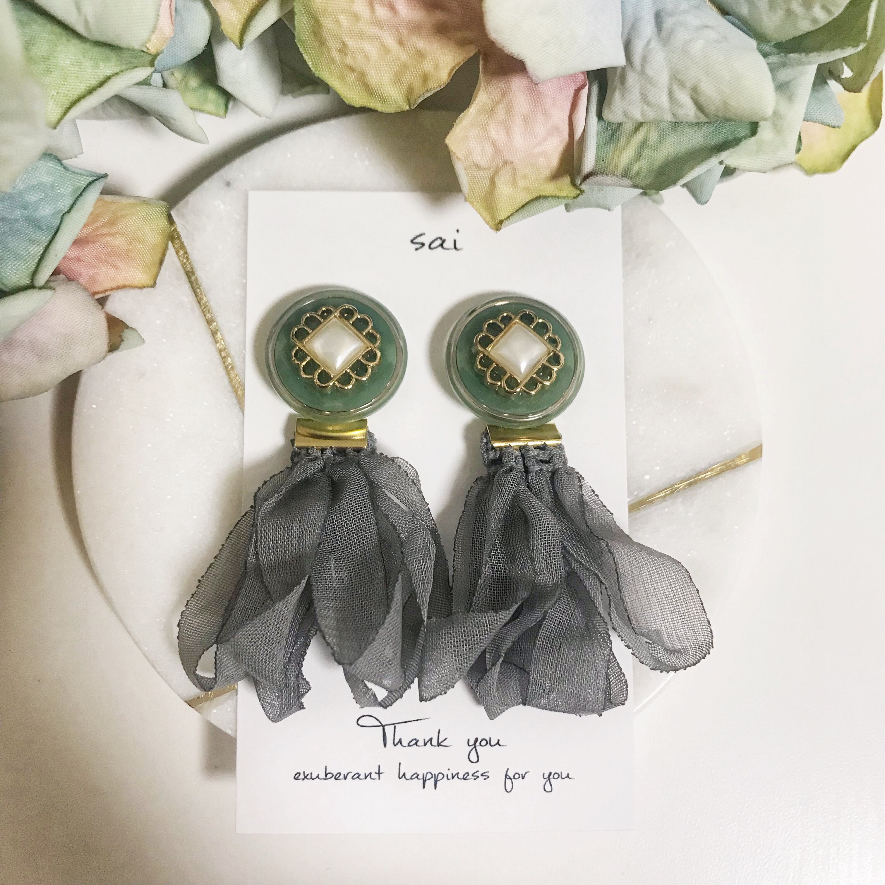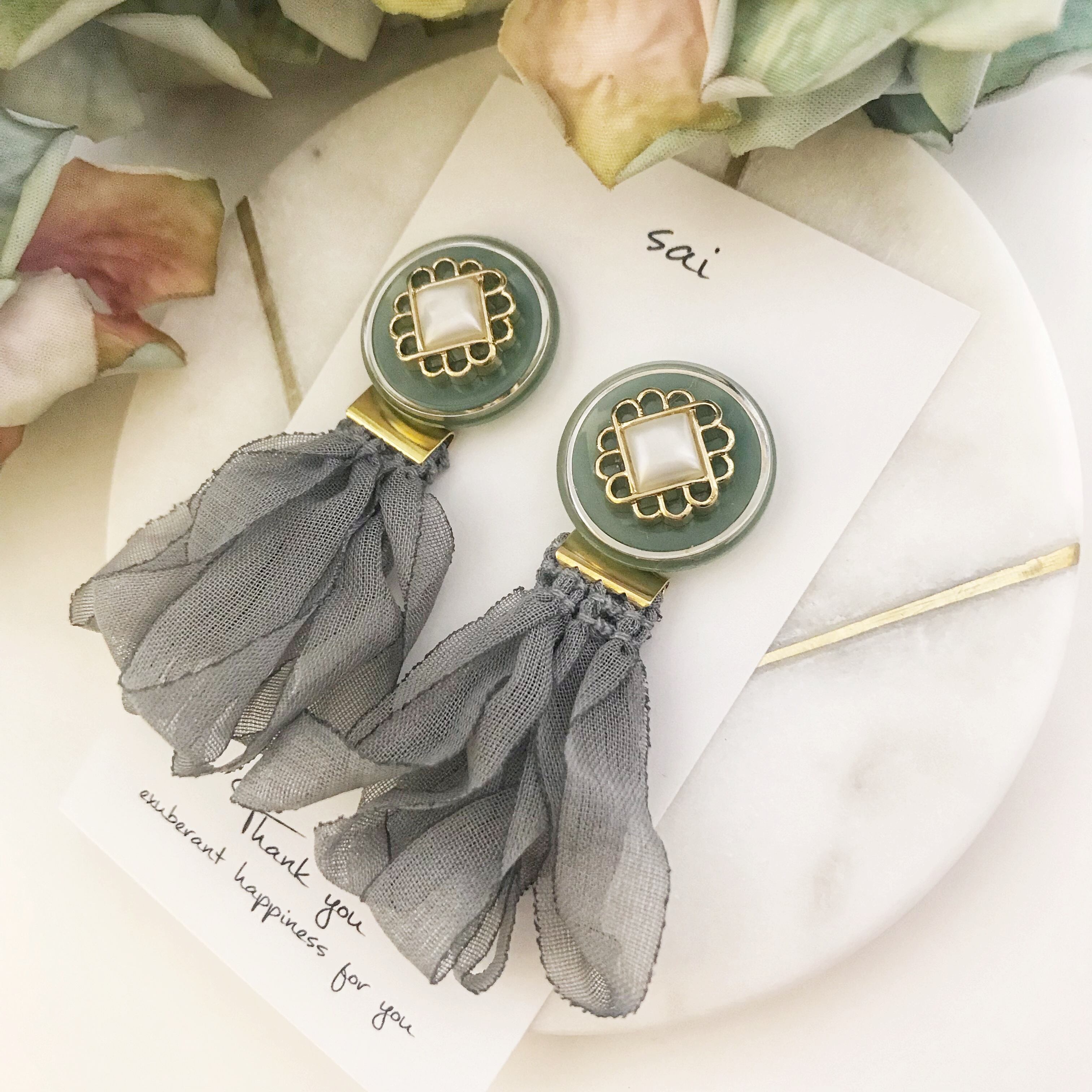 グリーンの一粒ボタンにグレーのシフォンタッセルを合わせました( ¨̮ )*
