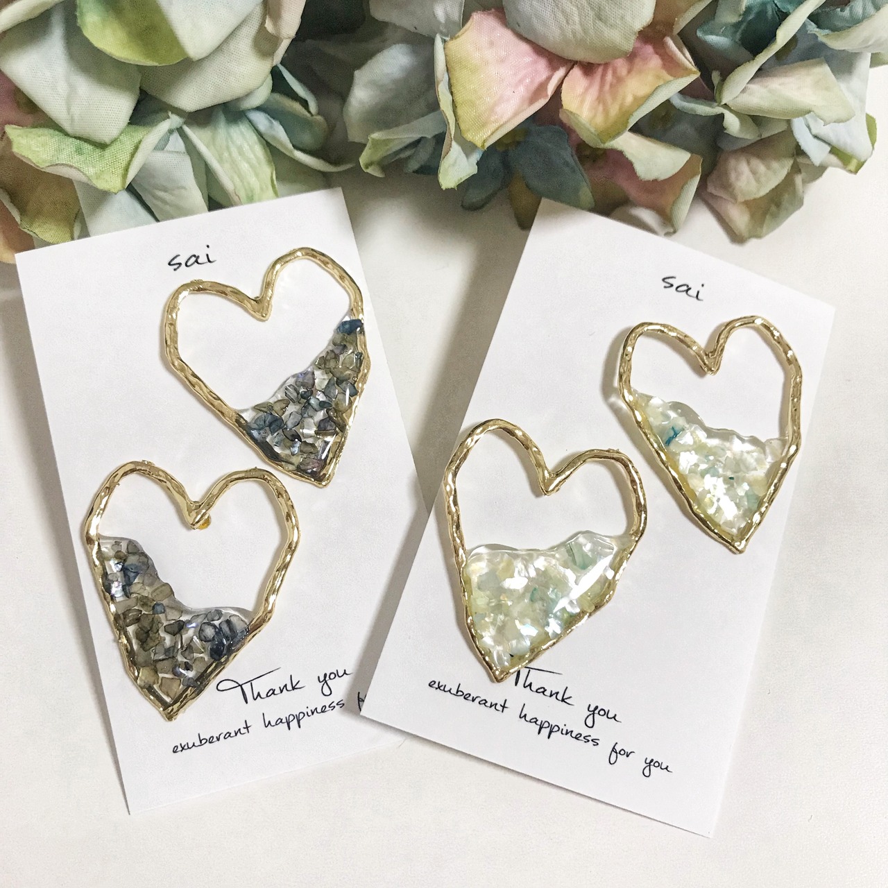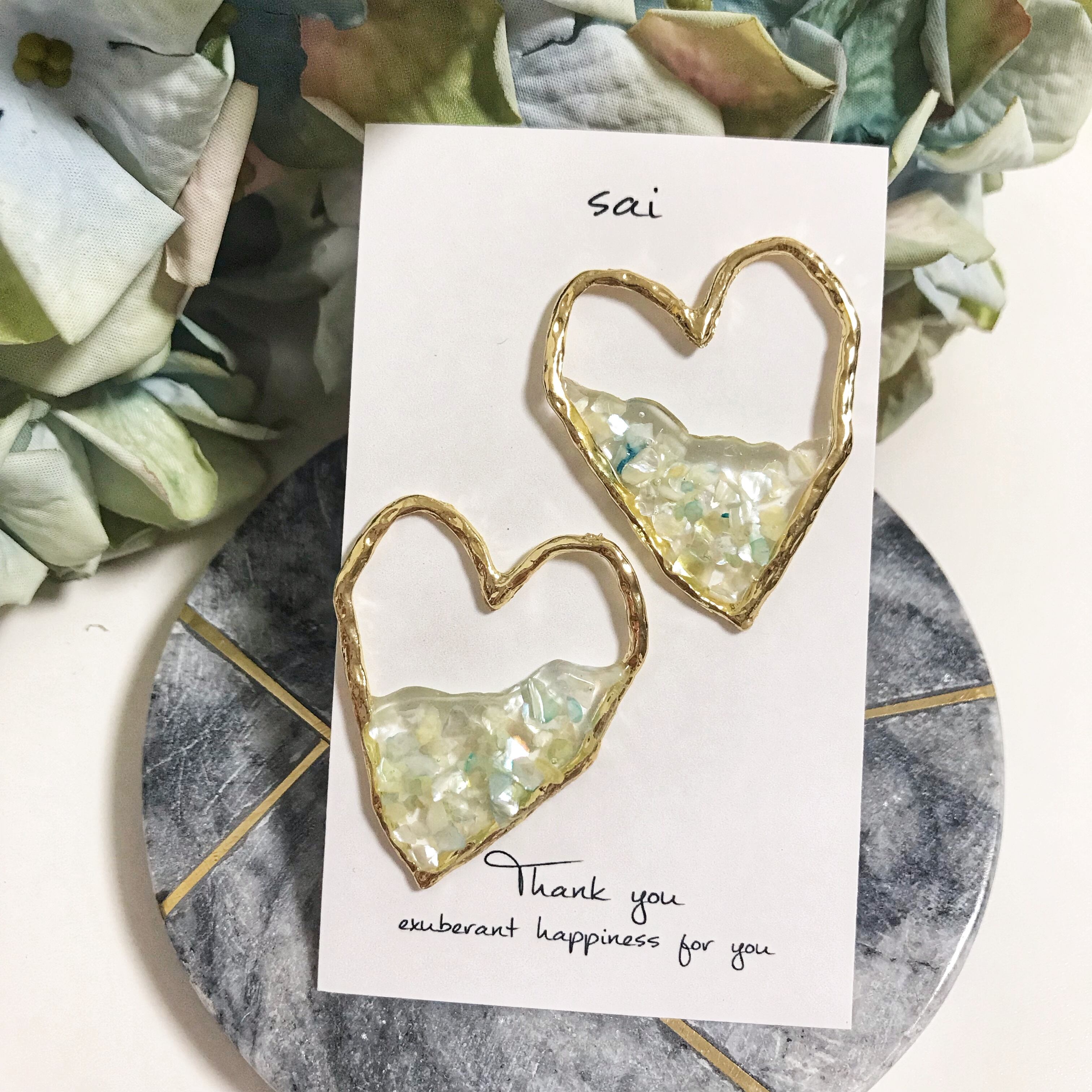 ゴールドの大ぶりのハートにシェルをレジンで埋め込みました( ¨̮ )*