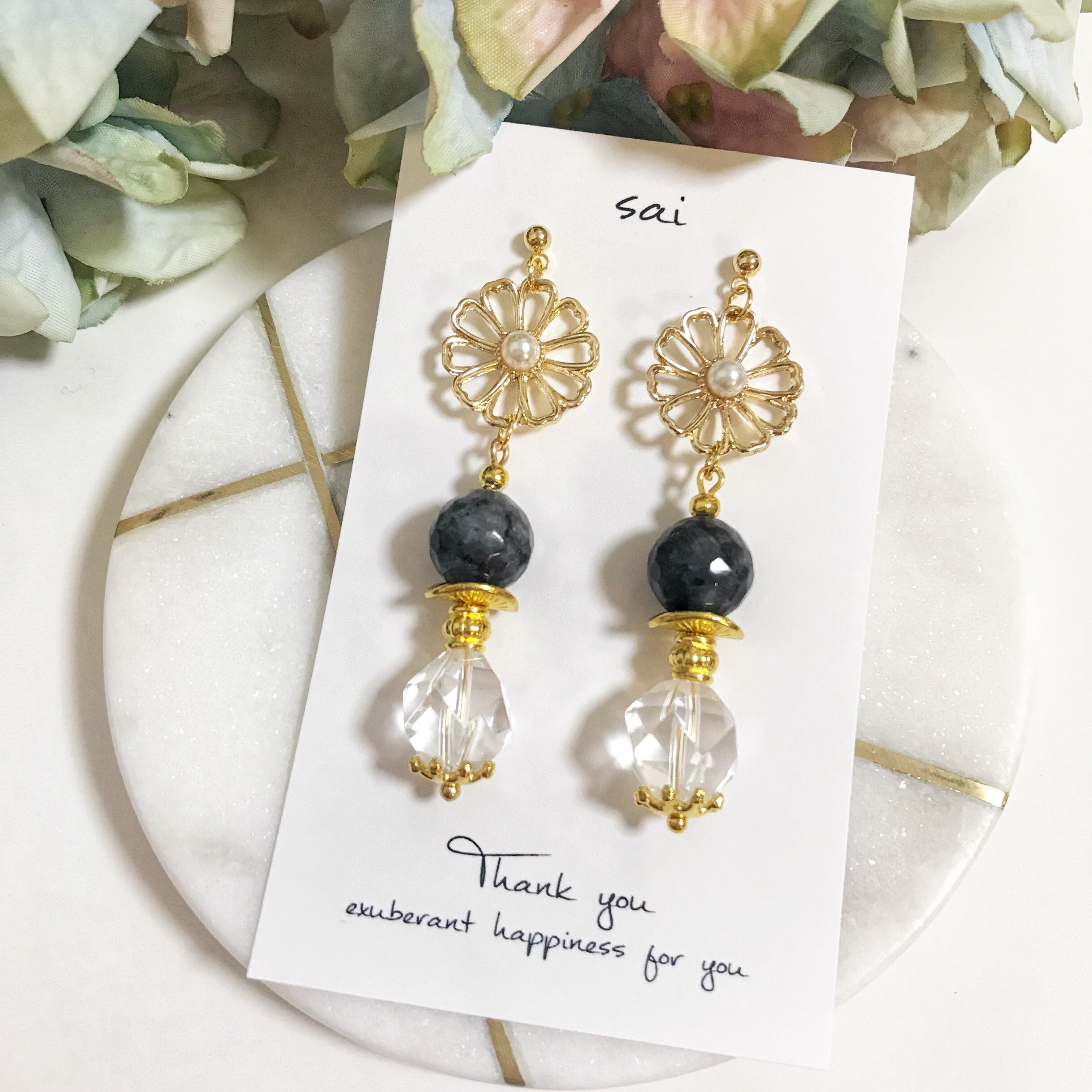 ゴールドのお花に多面カットのブラックラブラドライト 、スターカットの水晶を合わせました( ¨̮ )*