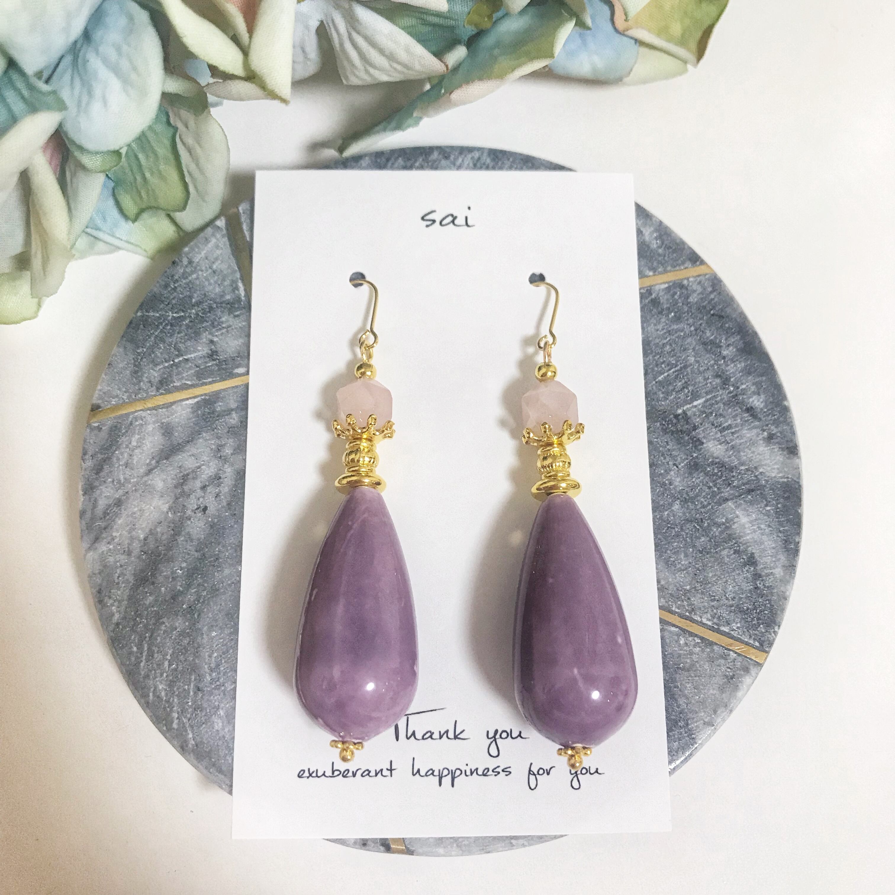 しずく型の陶器ビーズに多角カットの天然石"ローズクォーツ"を合わせました( ¨̮ )*