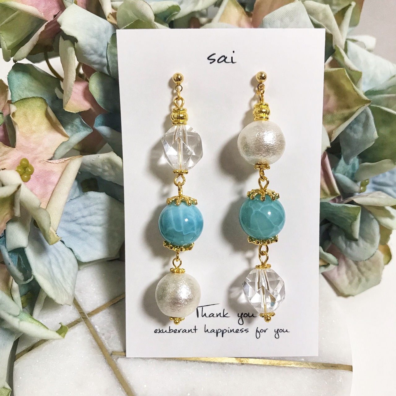 天然石のラリマーブルーアゲート(水面の様なデザイン)に多面カットの水晶、コットンパールの3連ピアス、イヤリングです( ¨̮ )*