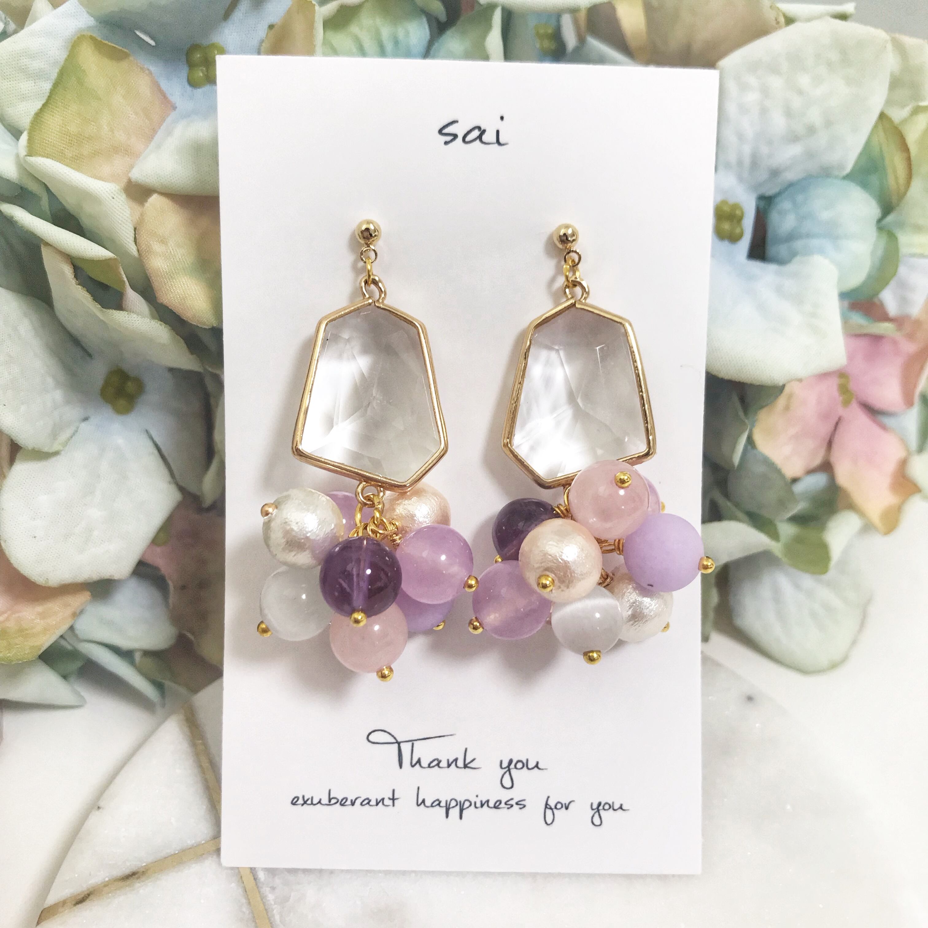 クリアガラスにパープル系の天然石、ガラス、コットンパールなどを合わせました( ¨̮ )*