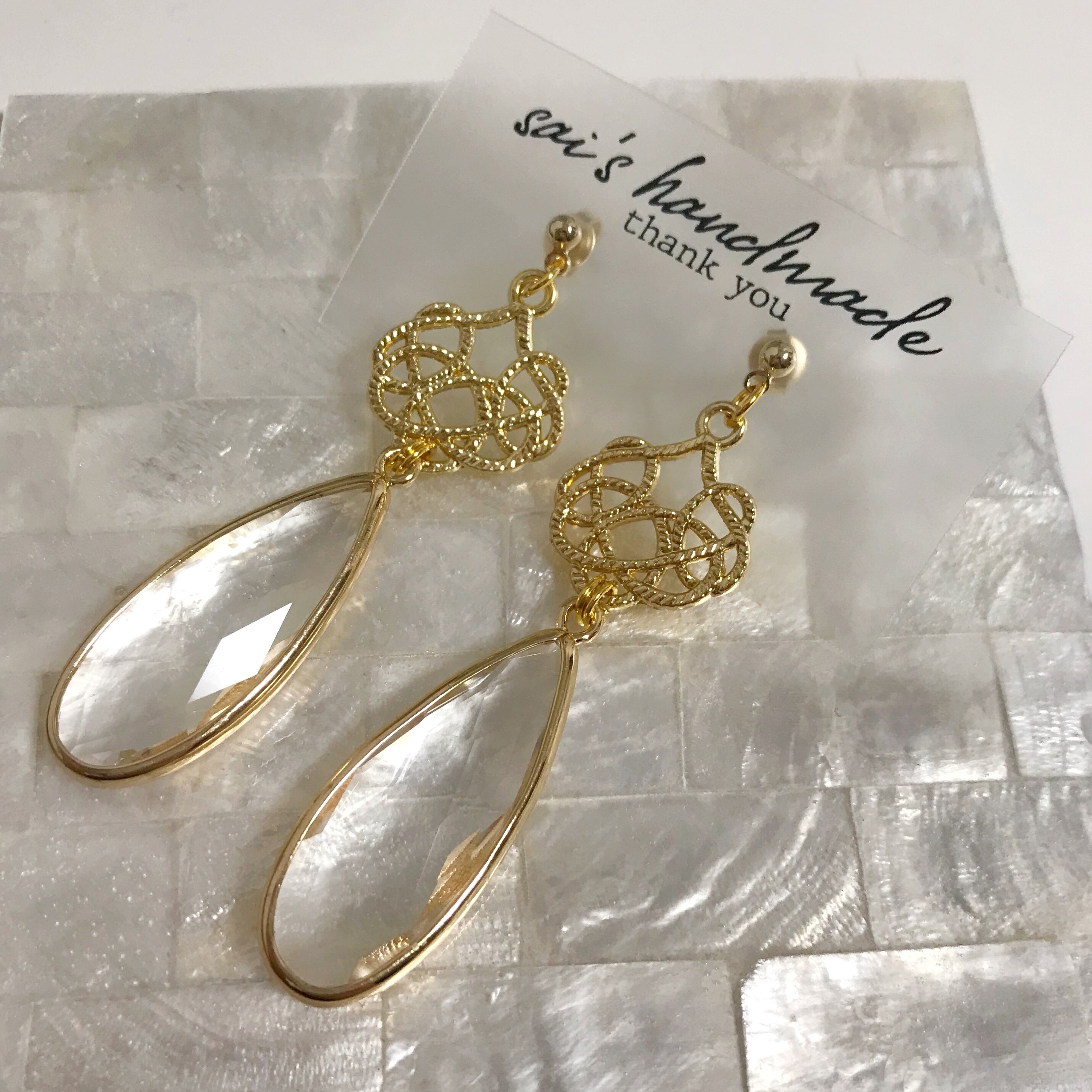 結び目のようなチャームに大きめの雫型のクリアガラスを合わせました( ¨̮ )*