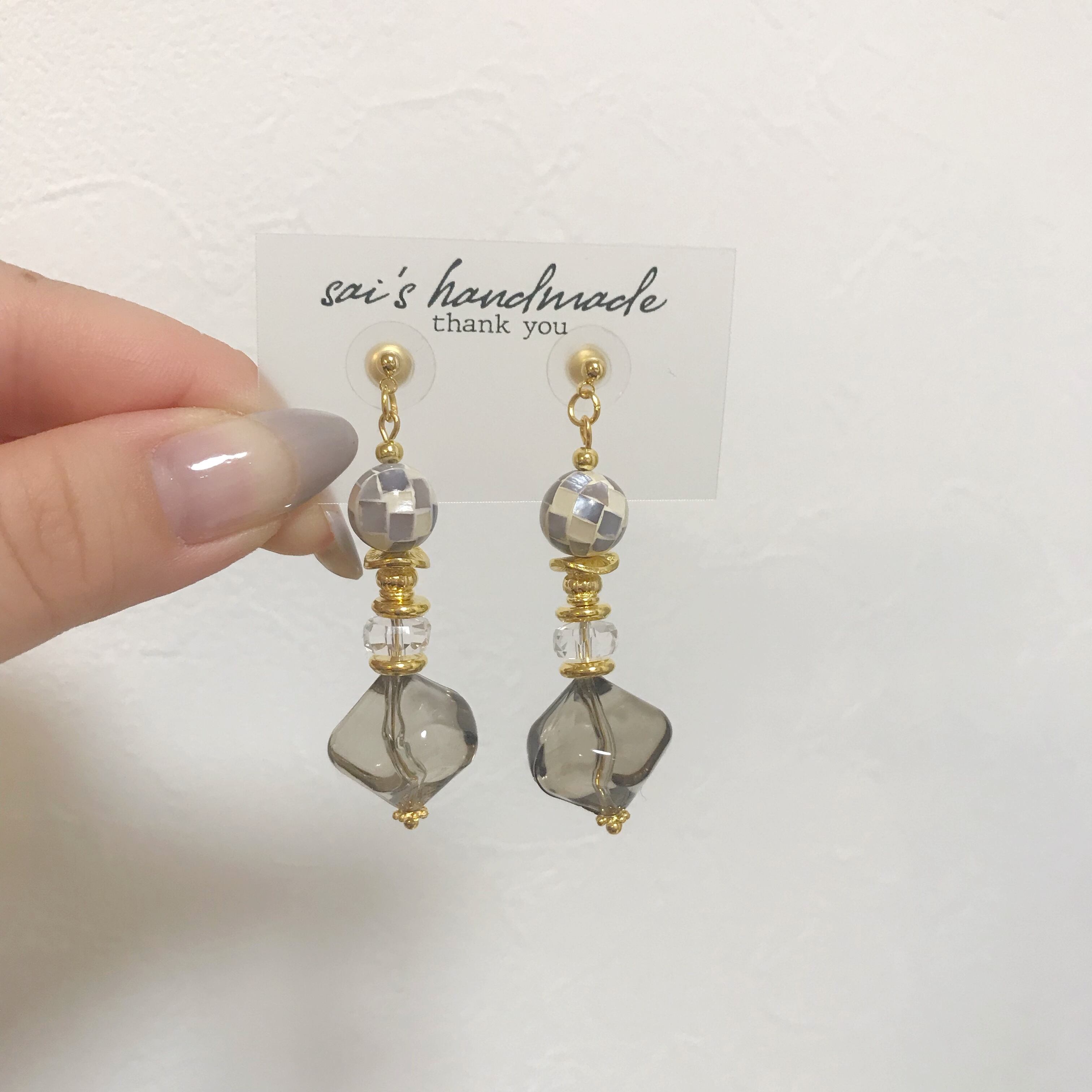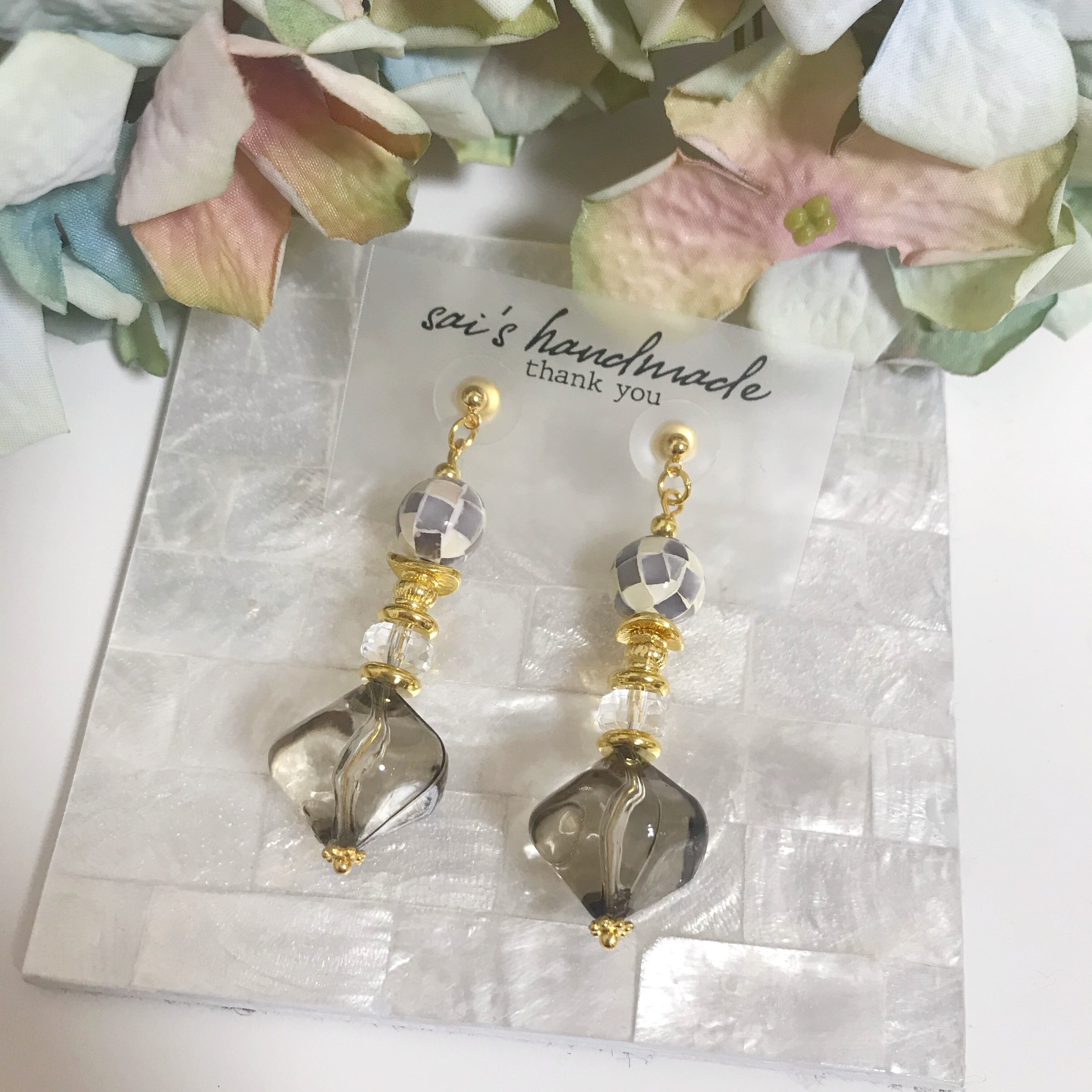 ホワイト×グレーのモザイクシェルのビーズにクリアガラス、ちゅるるんとしたクリアブラックのビーズを合わせました( ¨̮ )*