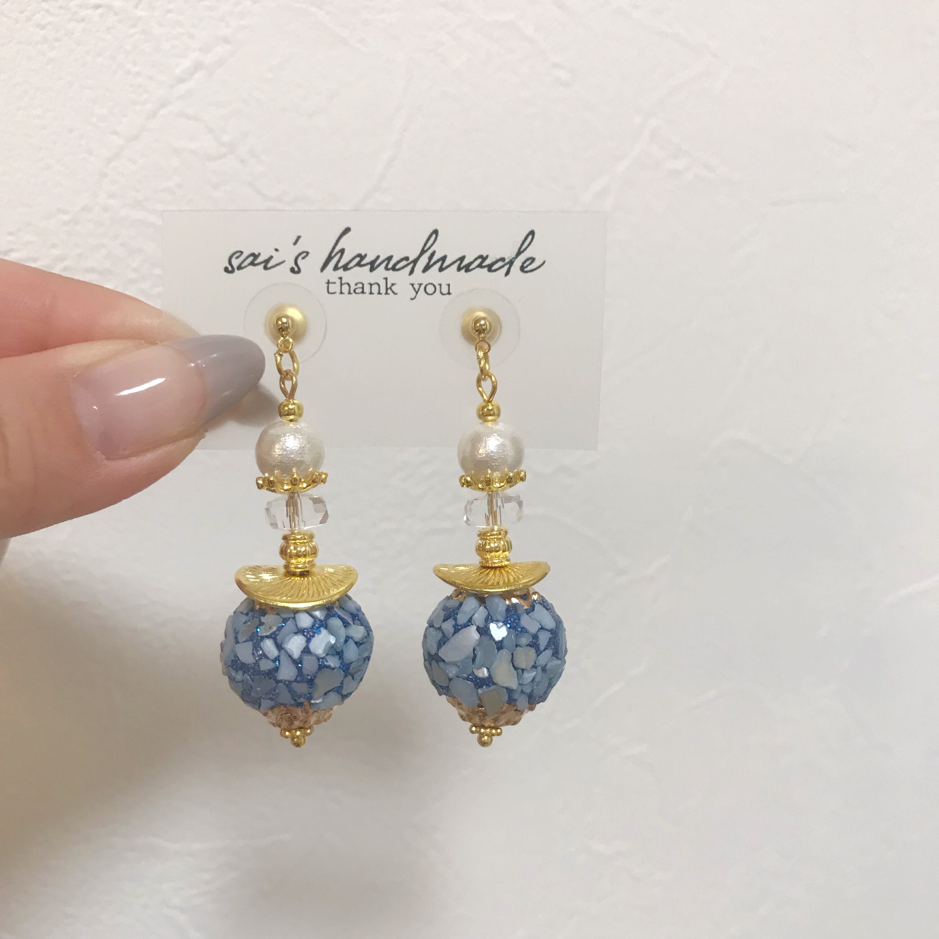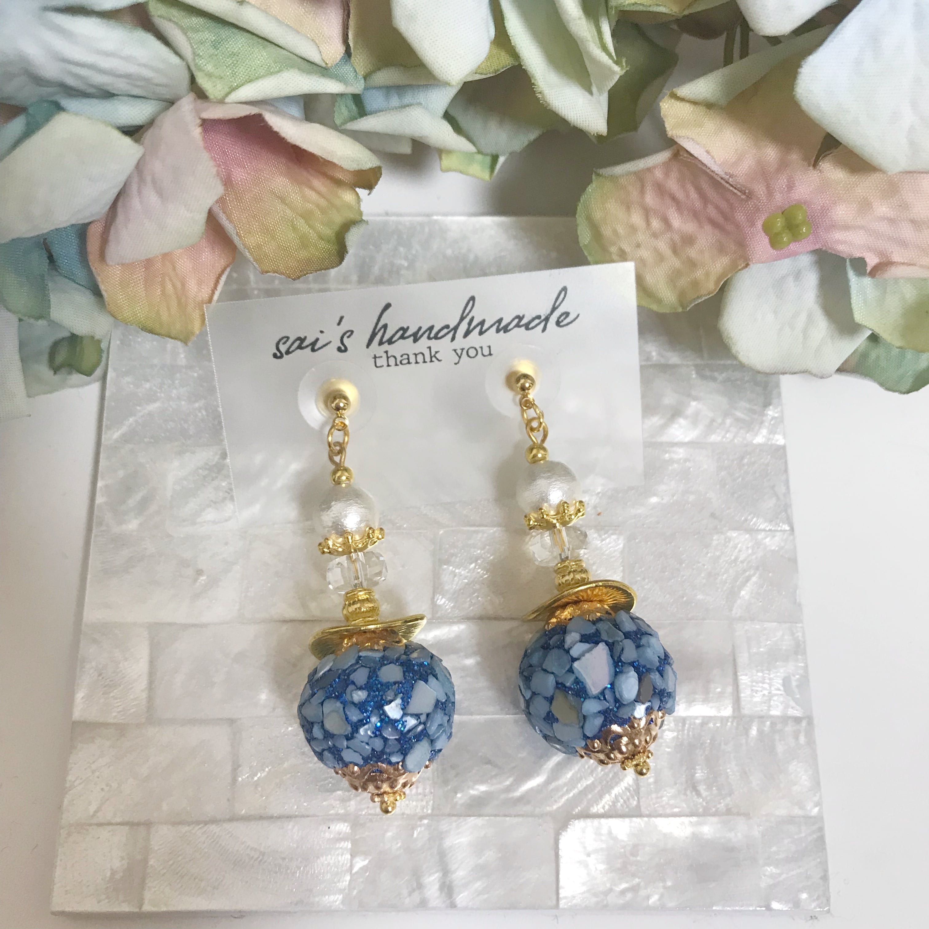 ブルーのフレークシェルの大ぶりのインドネシアビーズに、ガラス、コットンパールを合わせました( ¨̮ )*