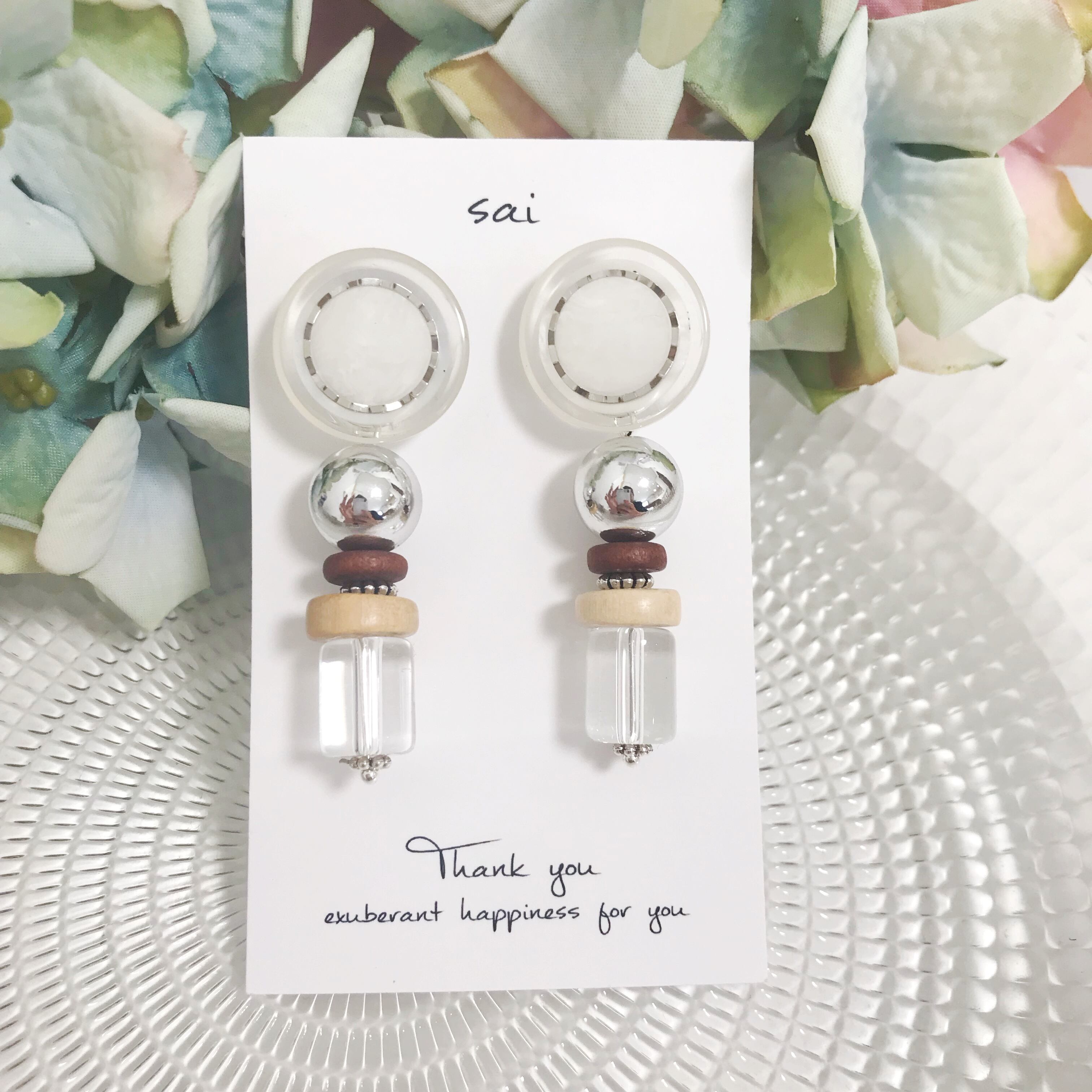 クリアボタンのシンプルなパターンと、クリア×シルバービーズをぶら下げたパターンとお楽しみ頂けます❁