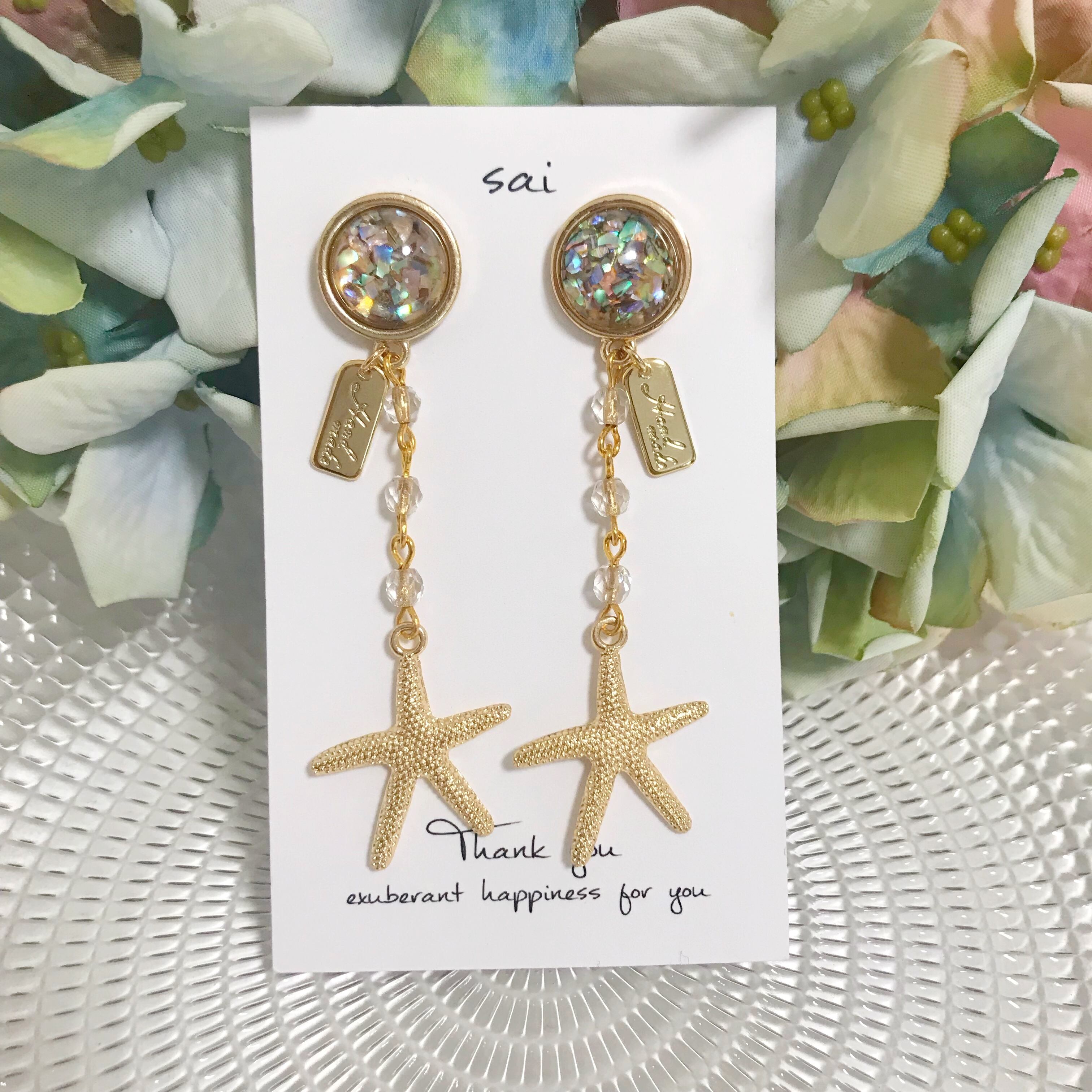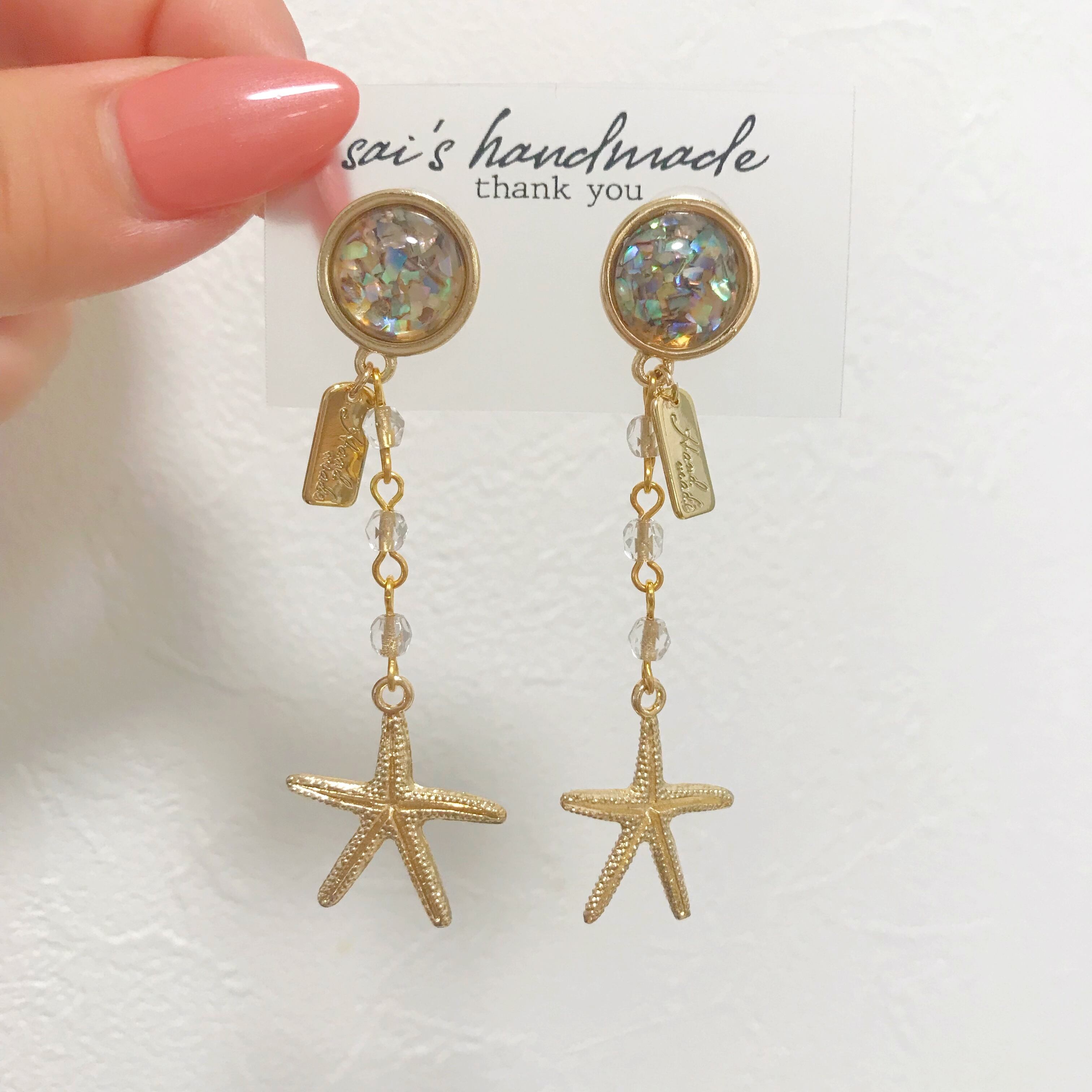 シェルのピアスに、チェコビーズを繋げて、大きめのヒトデを合わせました⌄̈⃝❤︎