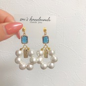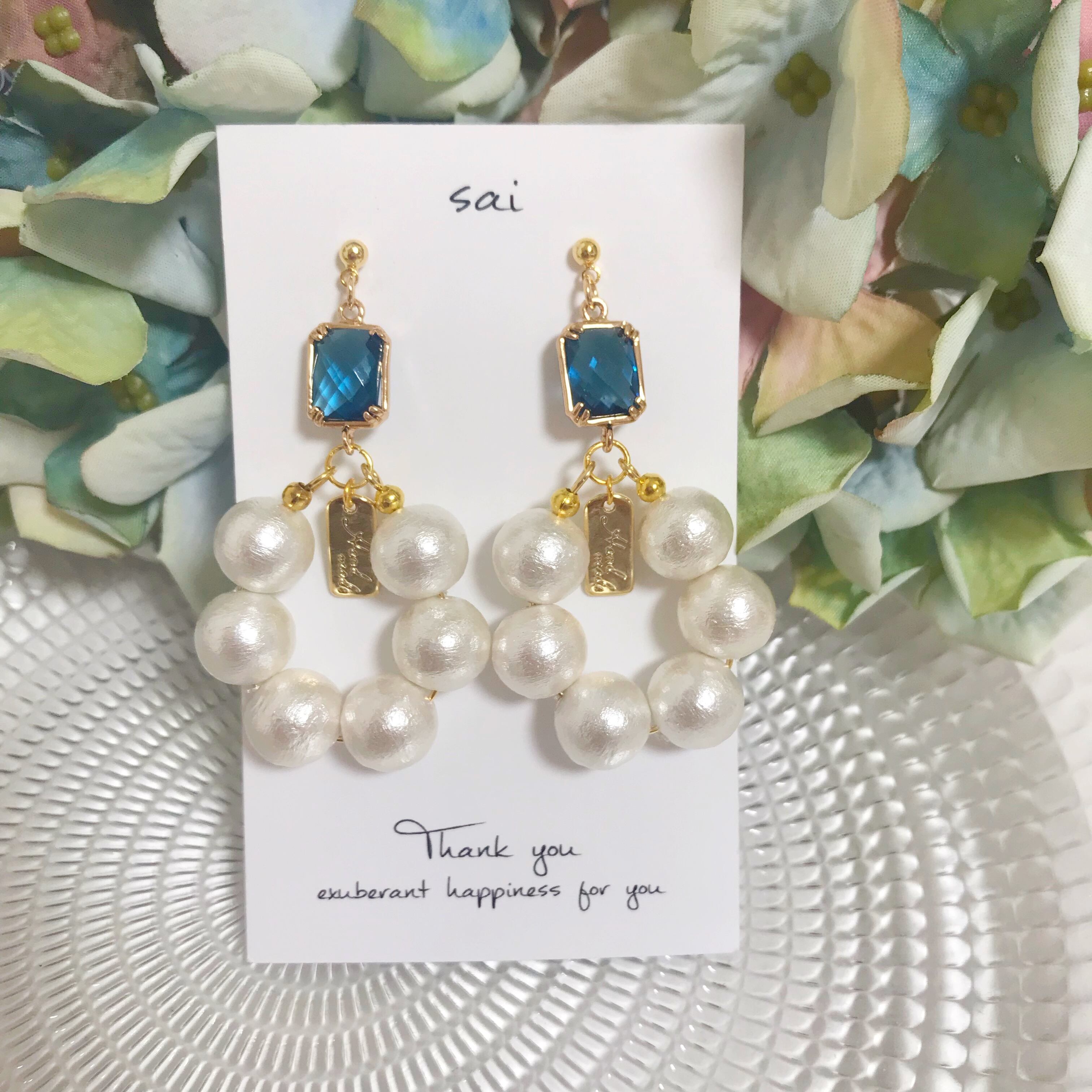 高品質のブルーガラスにホワイトのコットンパールのフープを合わせました⌄̈⃝❤︎
