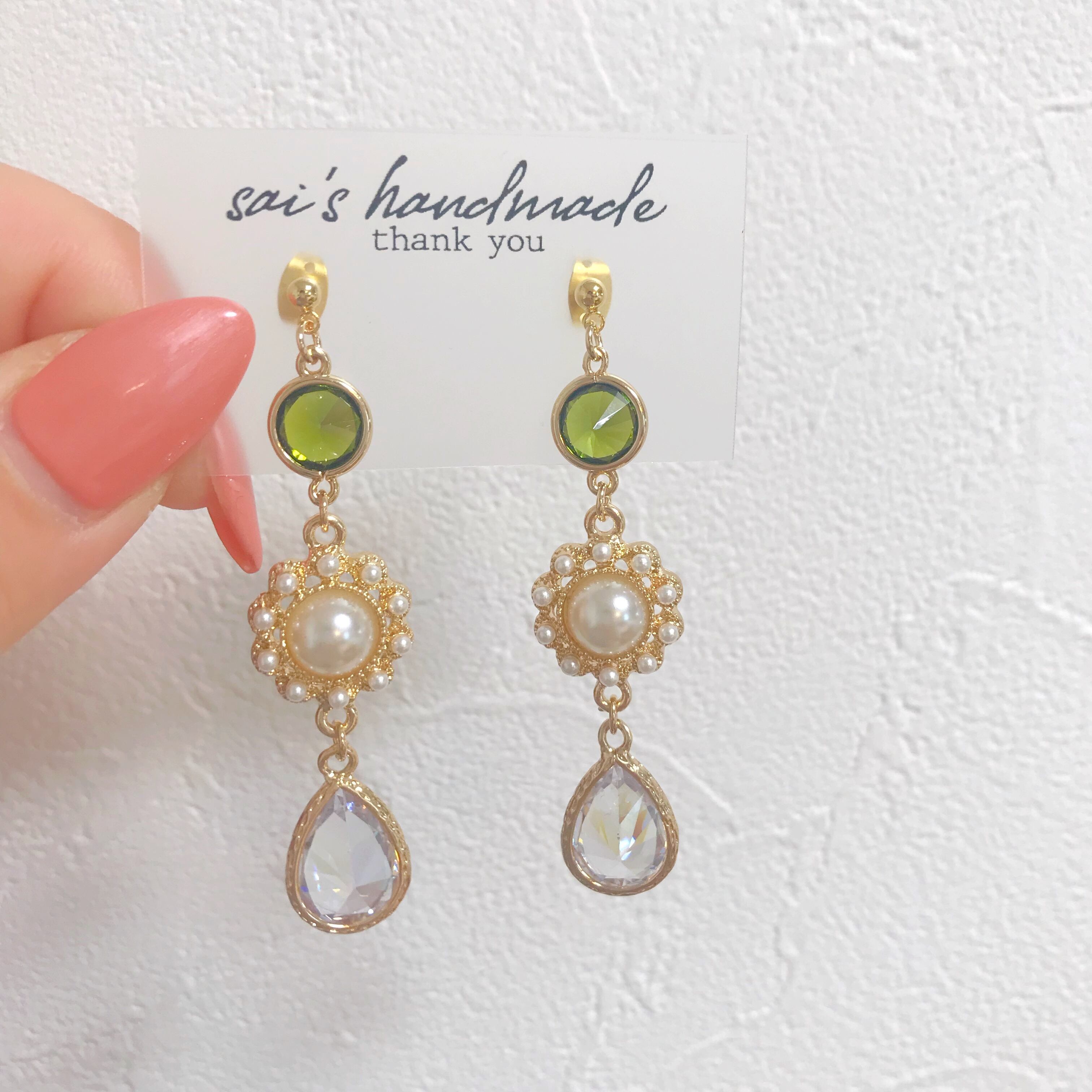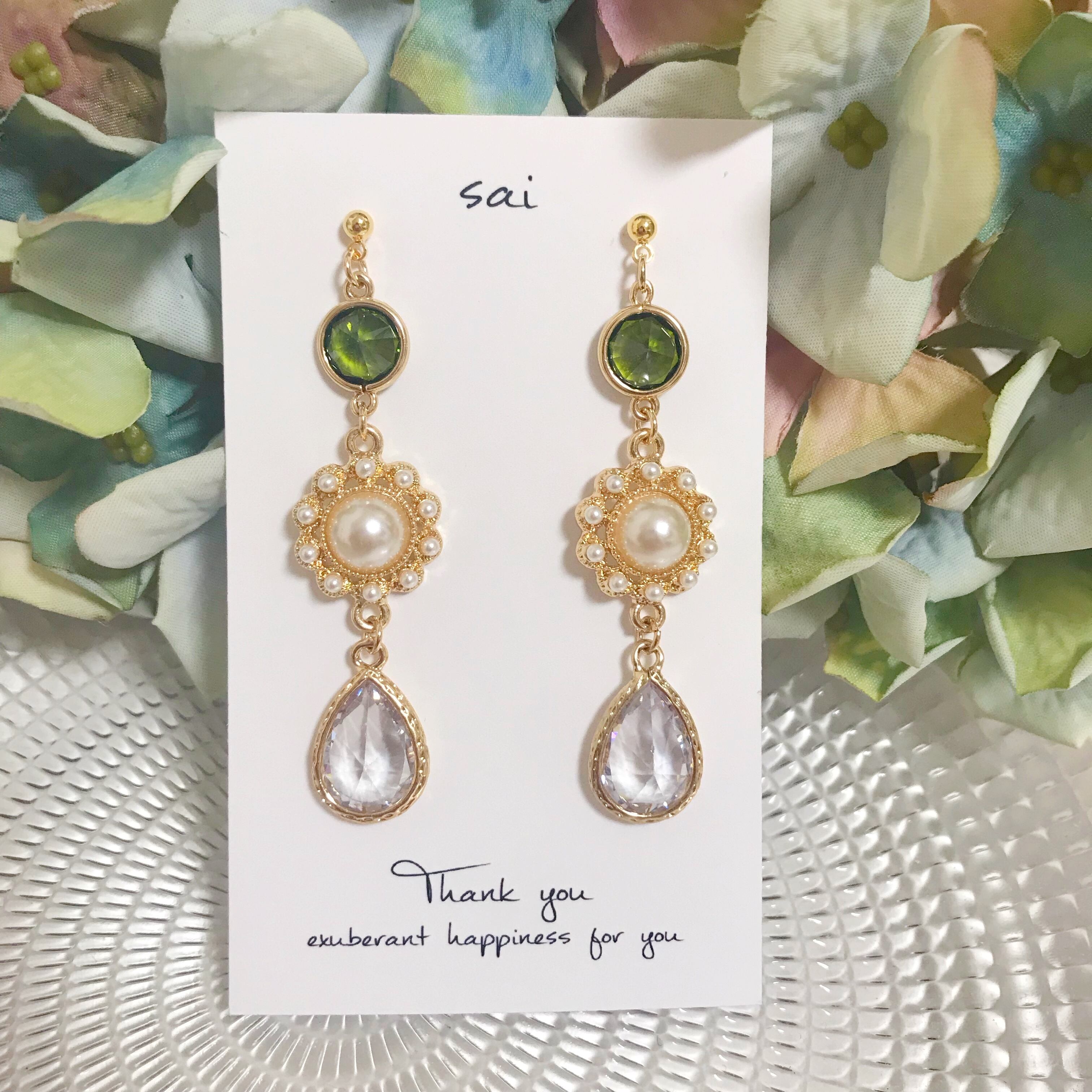 黄緑のガラスにパール、高品質のクリアガラスを合わせた華やかなpierce/earringです⌄̈⃝❤︎