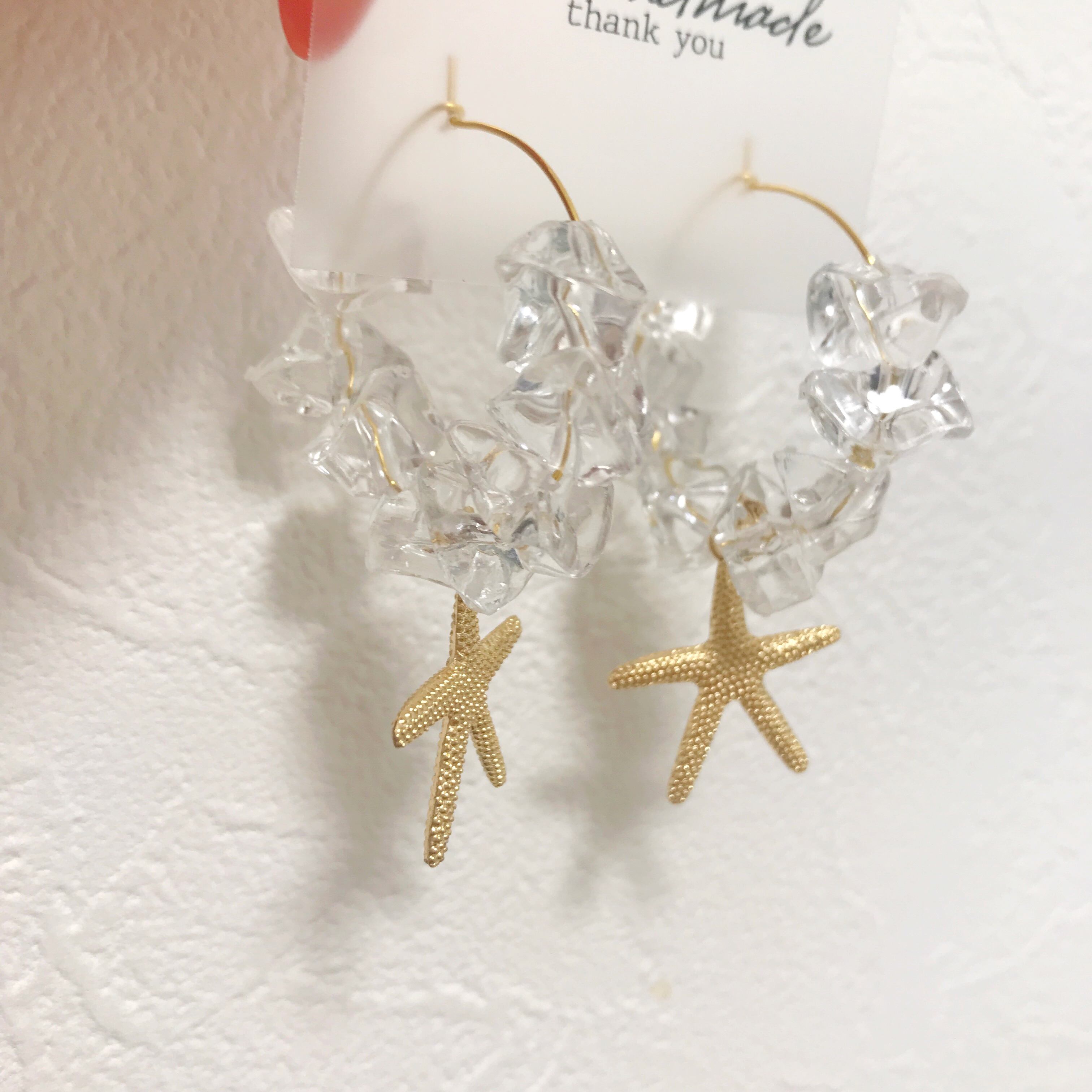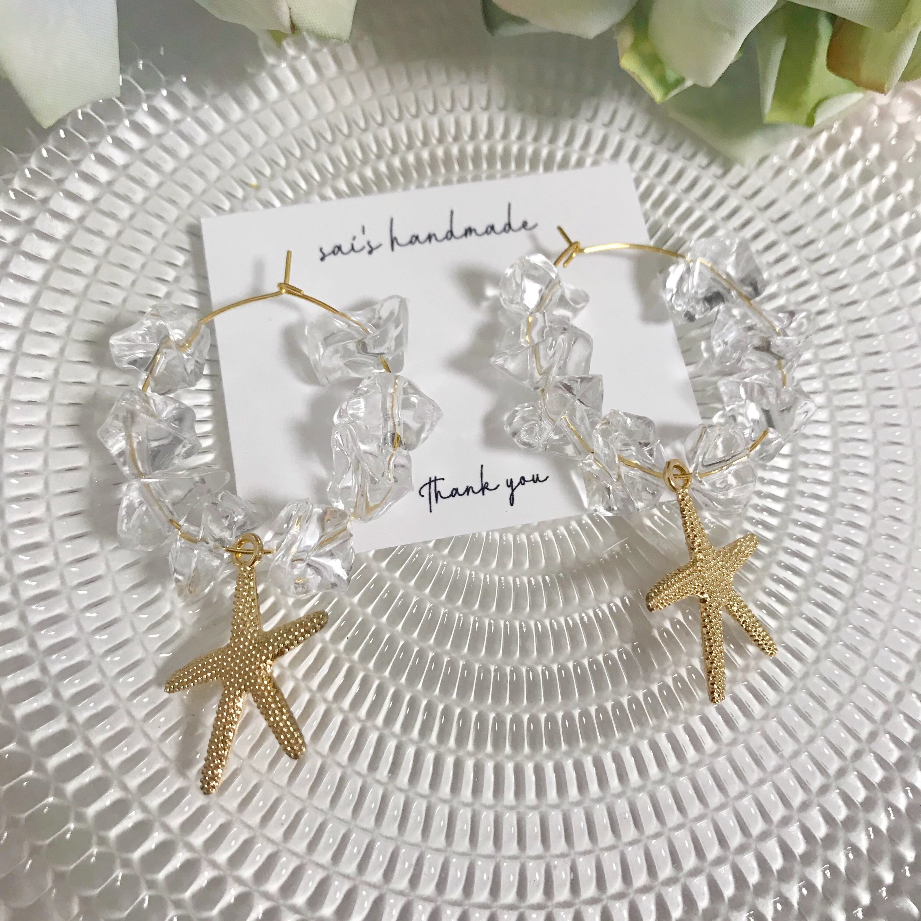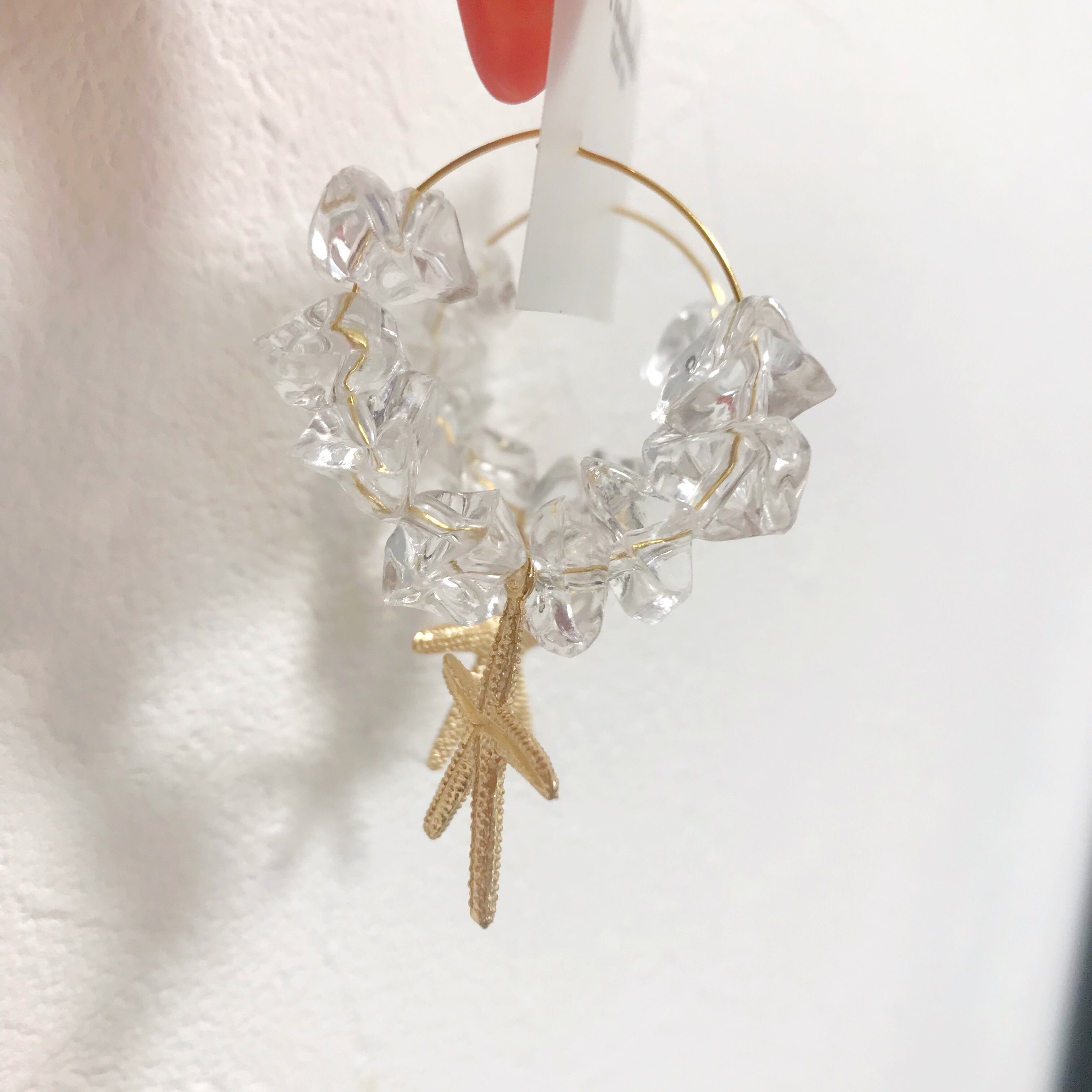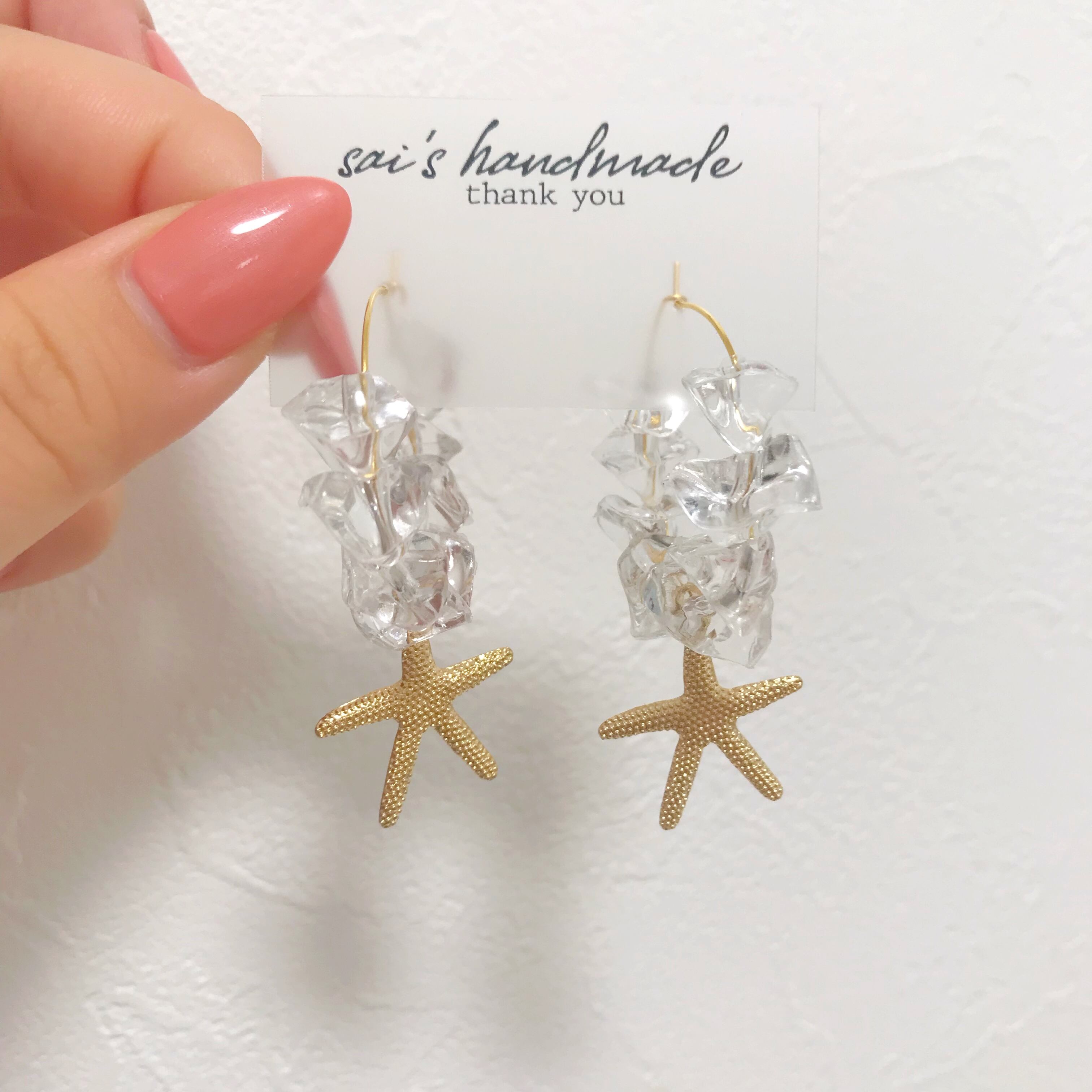 フープピアスに氷のような大きめの多角カットのクリアビーズにヒトデチャームを合わせた夏らしいピアスです⌄̈⃝❤︎