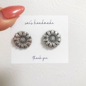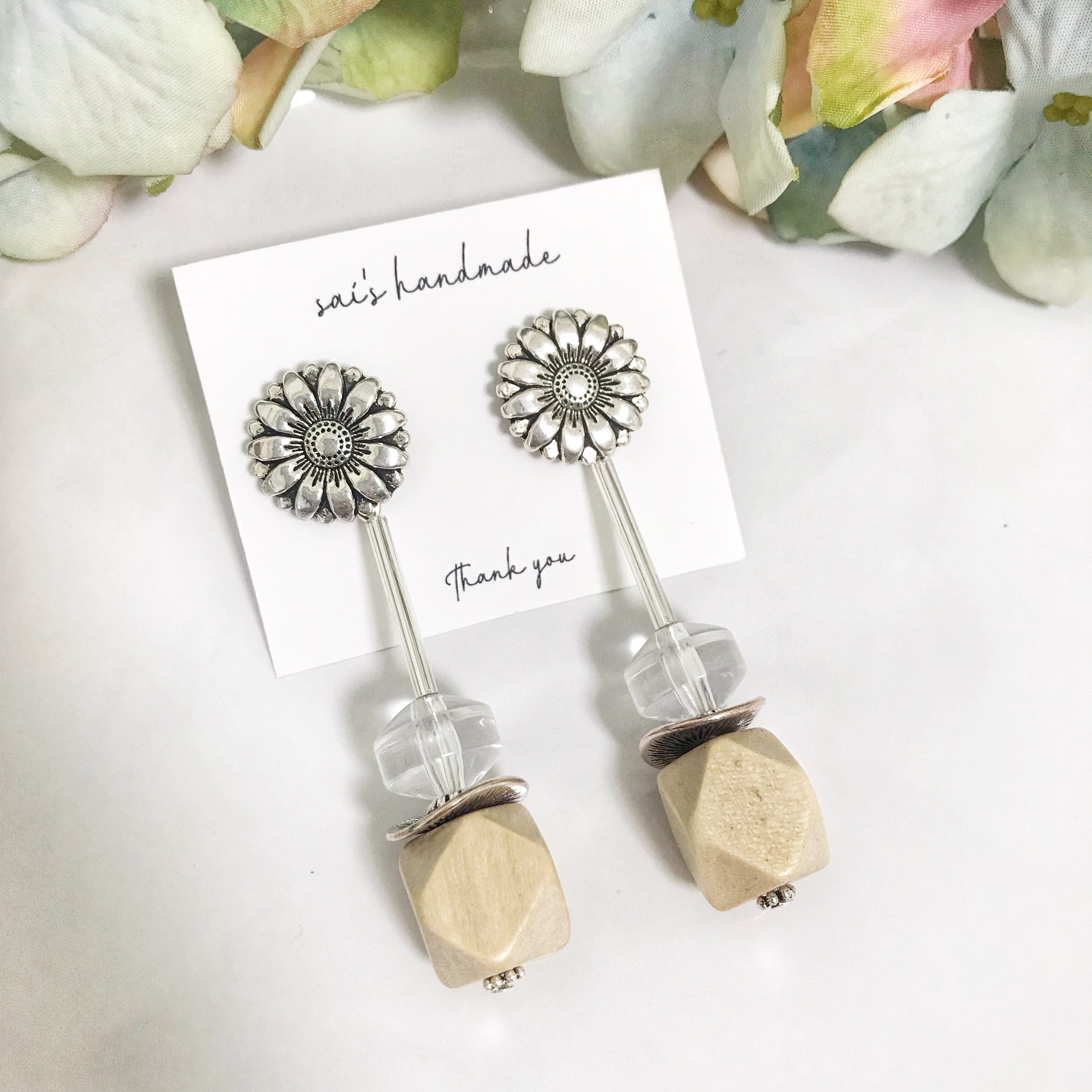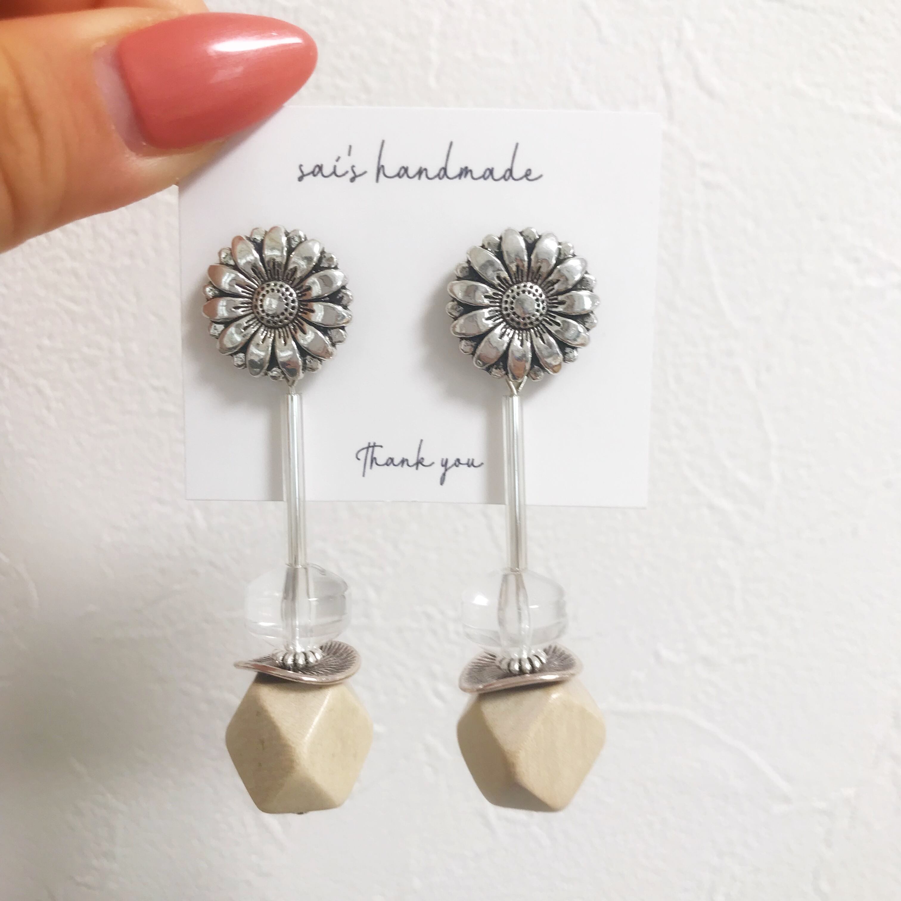 シルバーのフラワーボタンに、クリア×ウッドのロングpierce/earringです⌄̈⃝❤︎