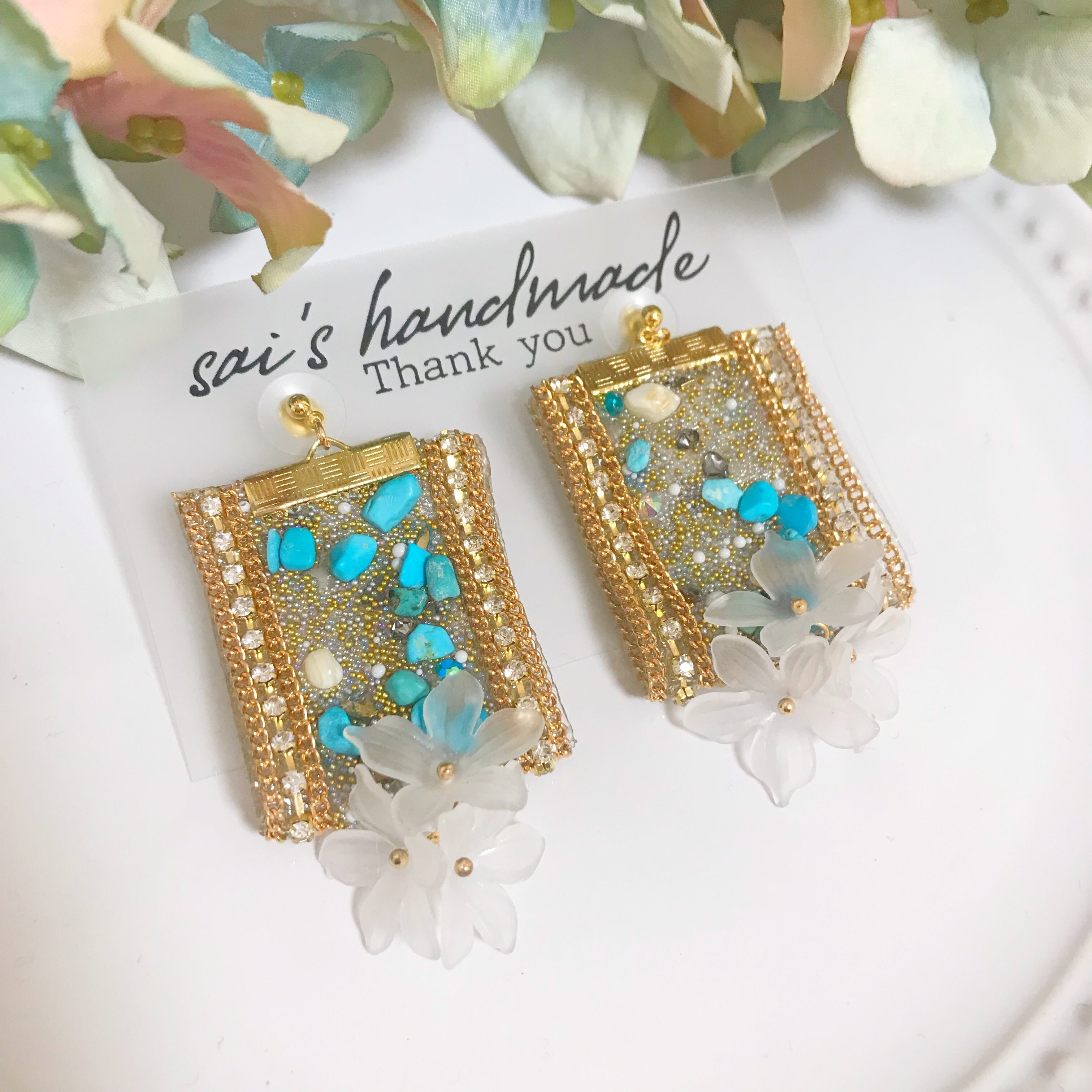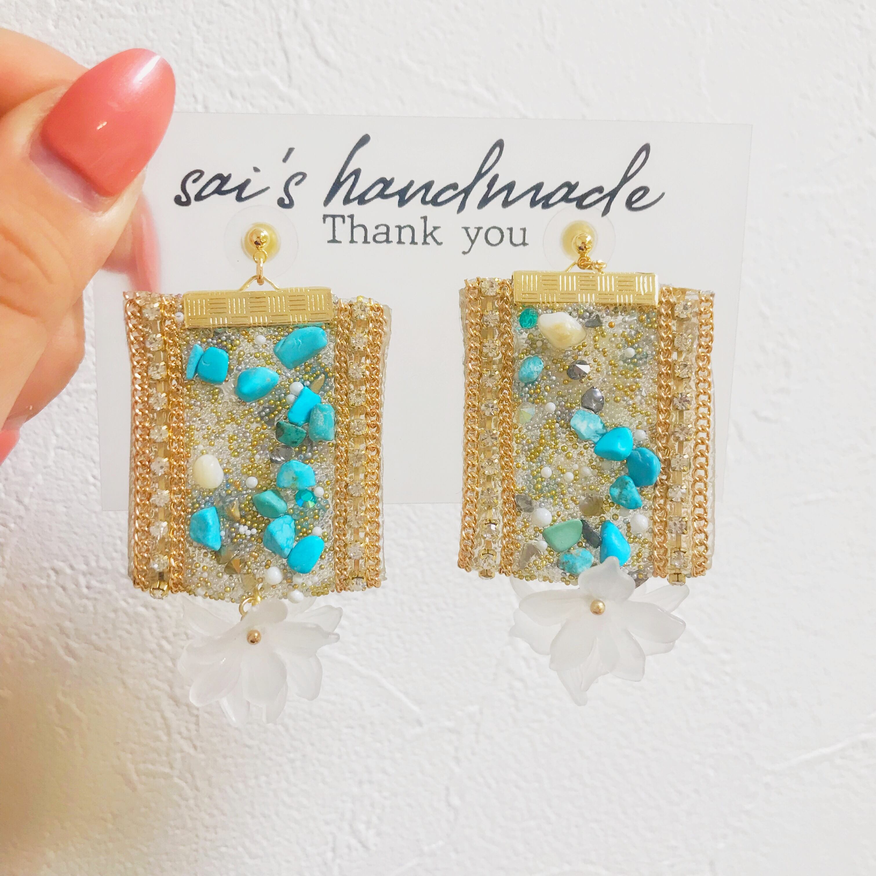 ターコイズ×ゴールドのガラスレースに三つお花合わせました⌄̈⃝❤︎