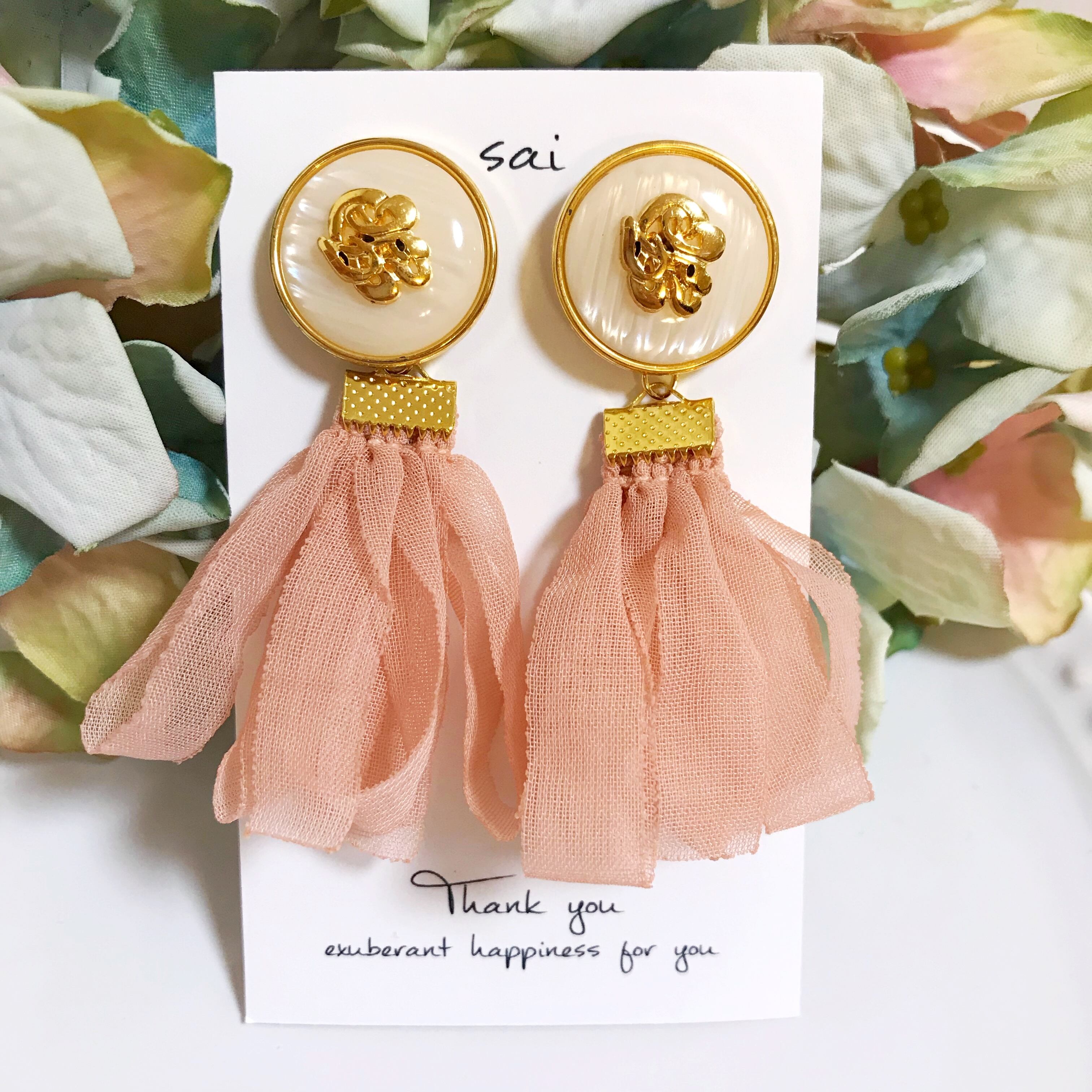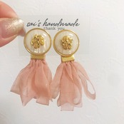 ホワイト×ゴールドのボタンにピンクベージュのシフォンタッセルを合わせたpierce/earringです⌄̈⃝❤︎