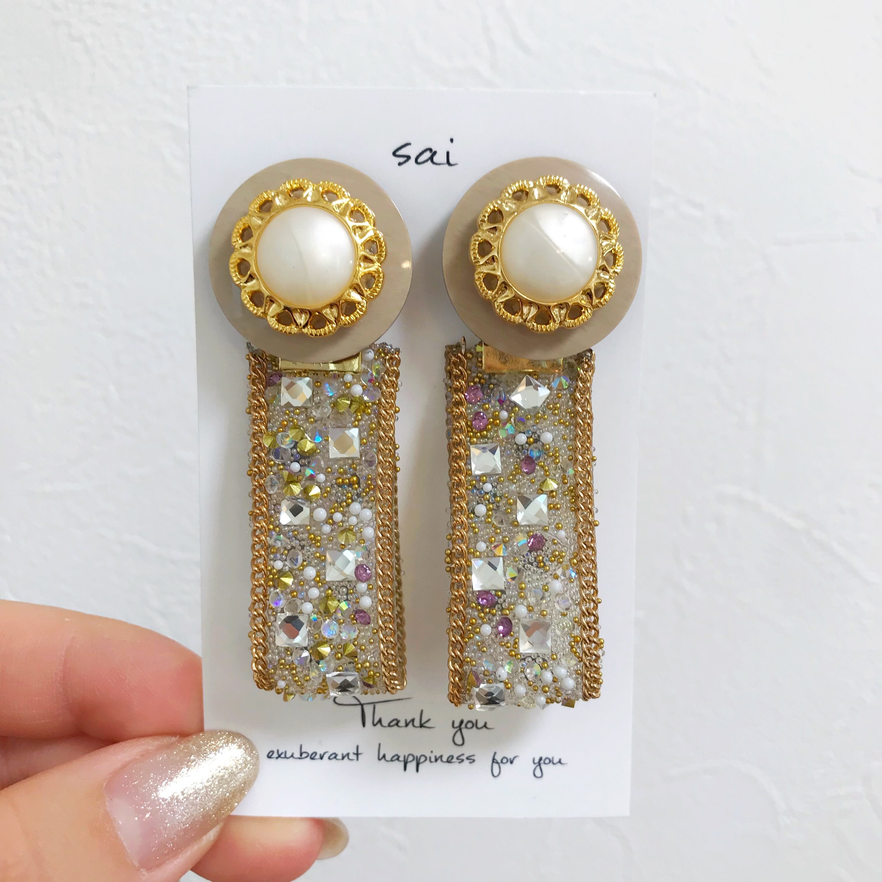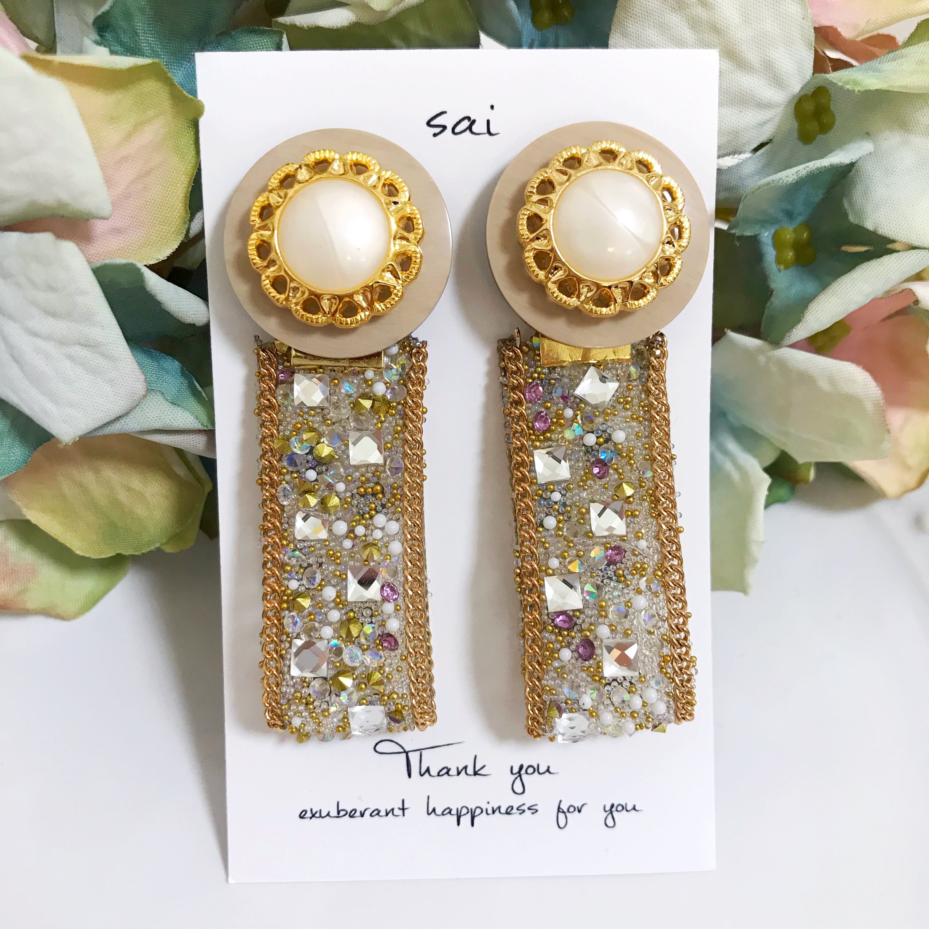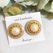 ベージュ×ゴールドのボタンにゴールドのガラスレースを合わせたpierce/earringです⌄̈⃝❤︎