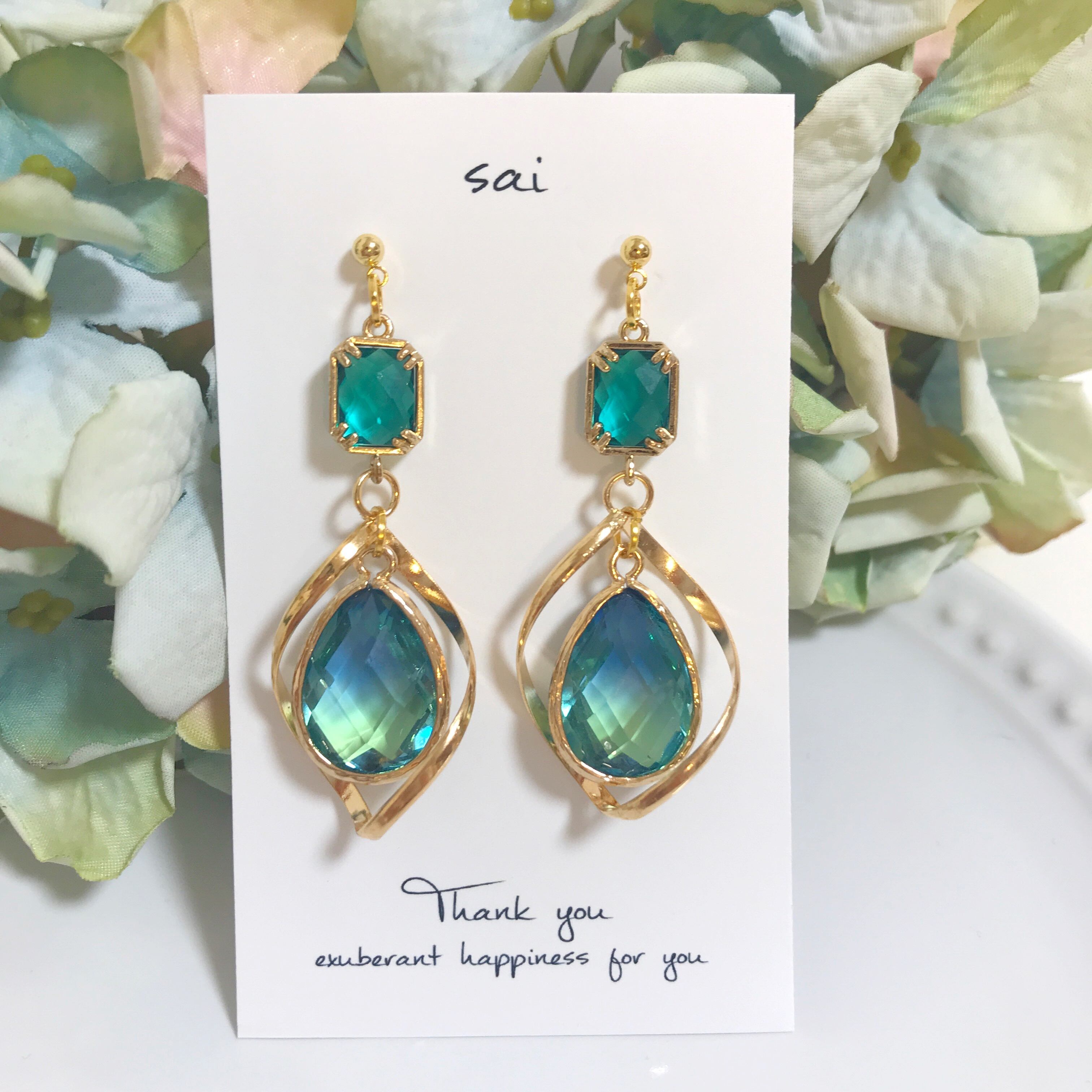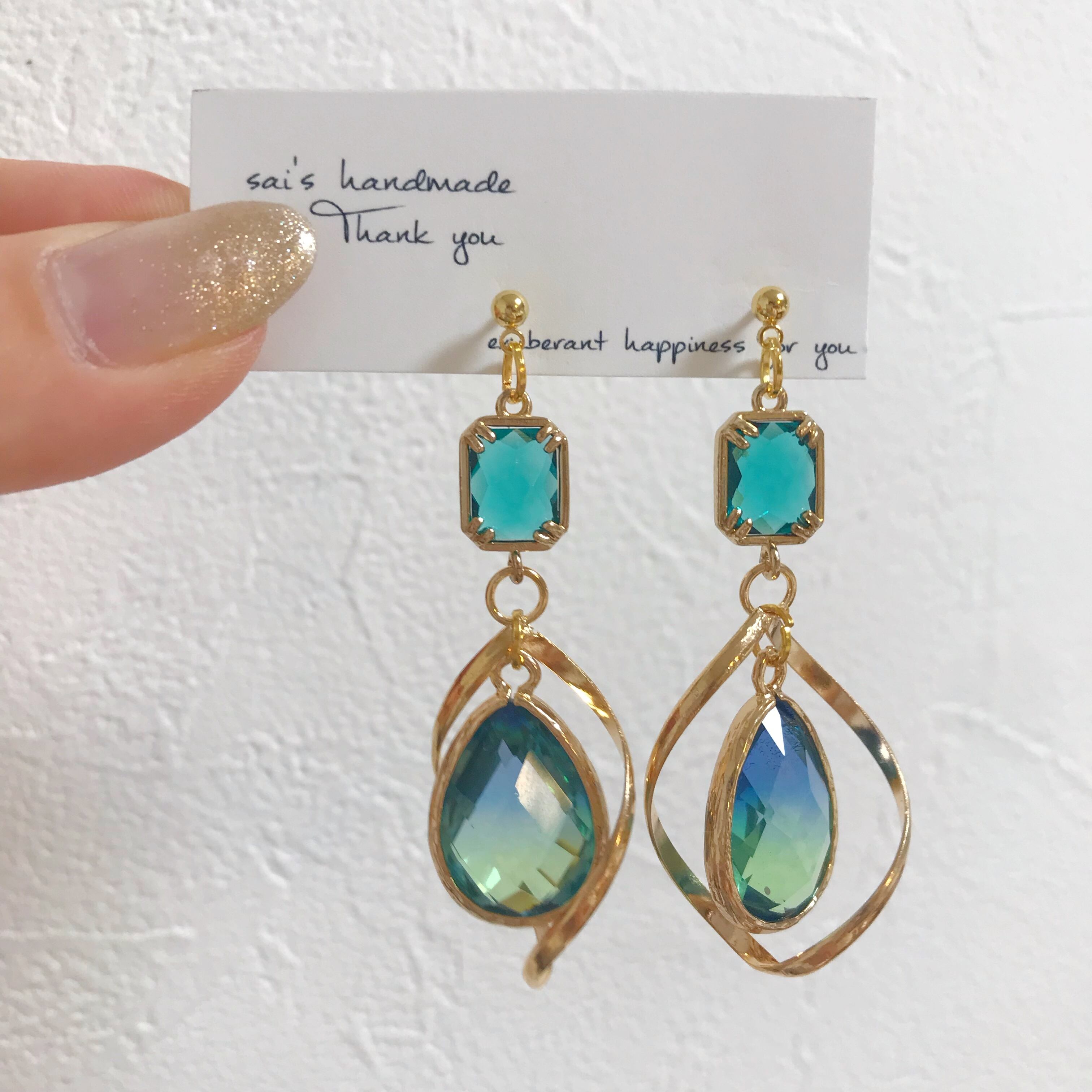 エメラルドグリーンのガラスにブルーグリーンのグラーデーションガラスを合わせた華やかなpierce/earringです⌄̈⃝❤︎