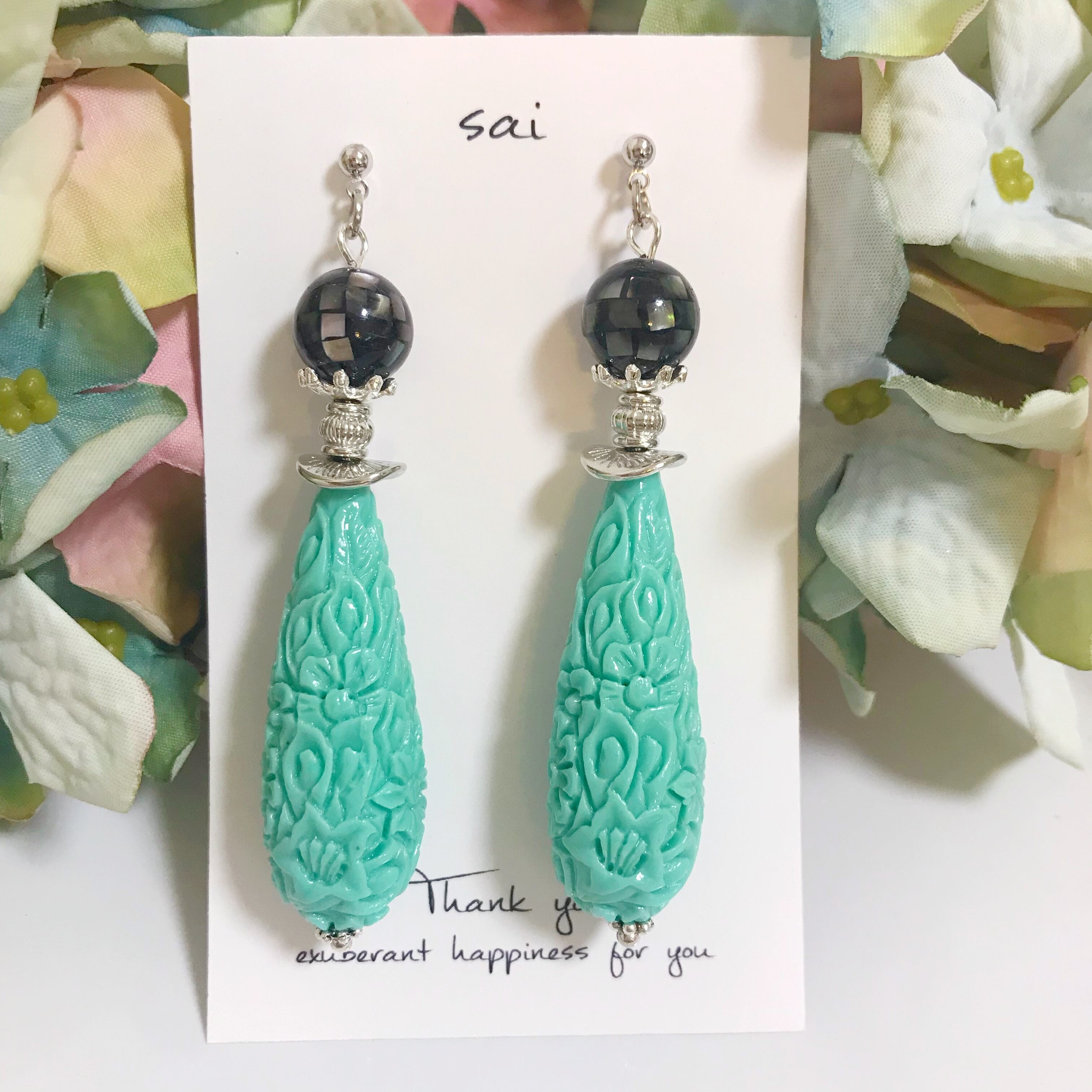 鮮やかな珊瑚の雫にブラックのモザイクシェル を合わせたpierce/earringです⌄̈⃝❤︎