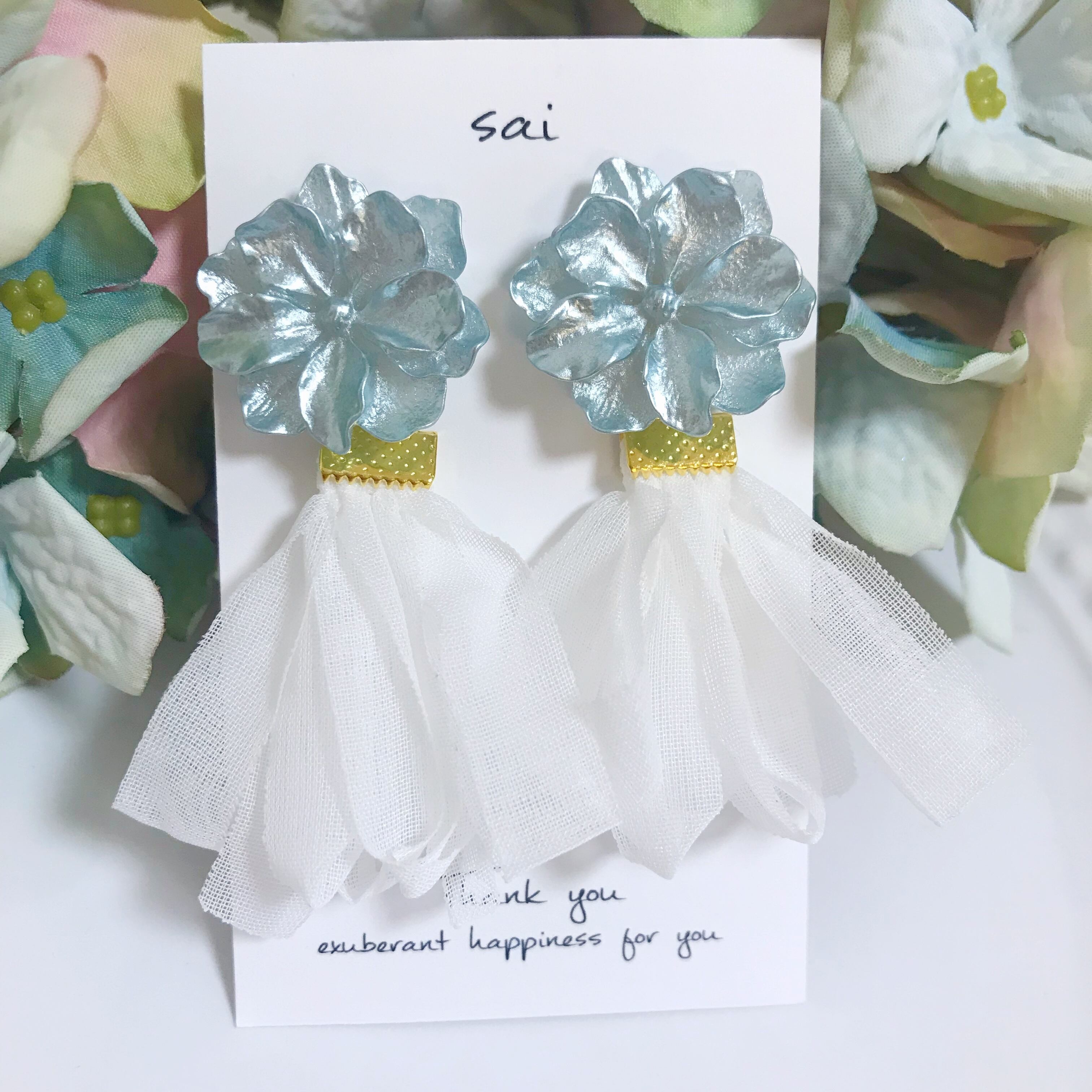 ブルーのフラワーにホワイトのシフォンタッセルを合わせた可愛らしいpierce/earringです⌄̈⃝❤︎