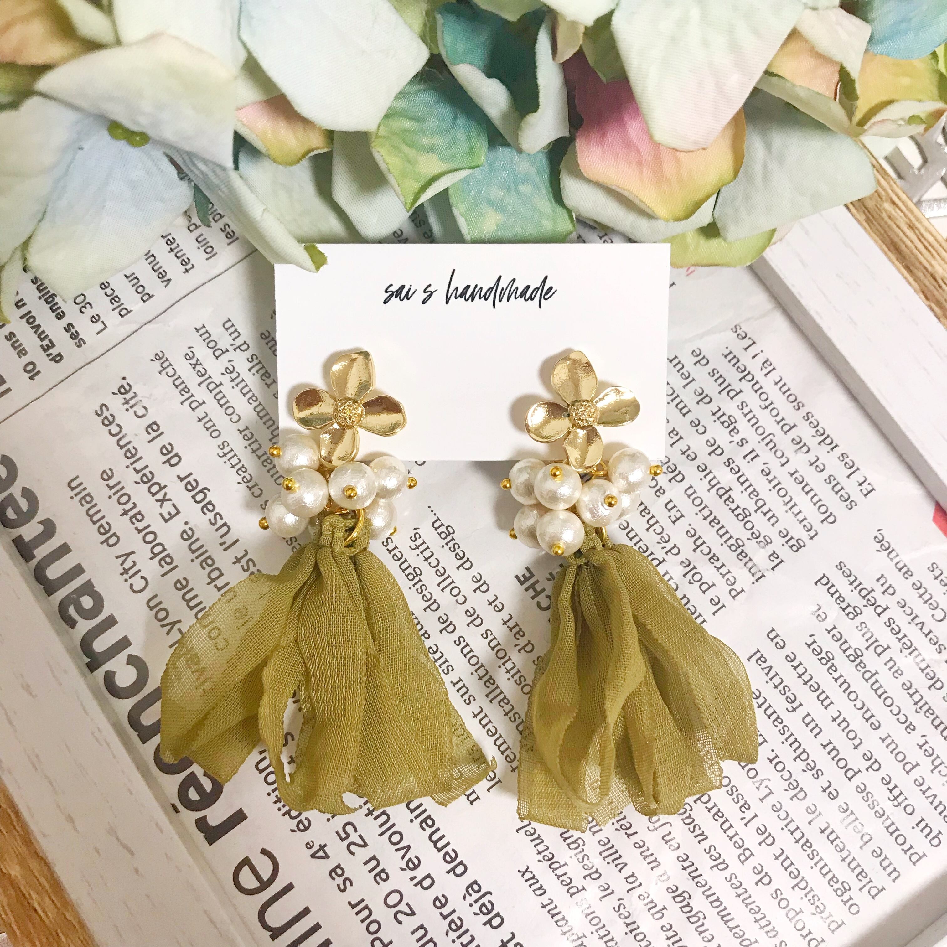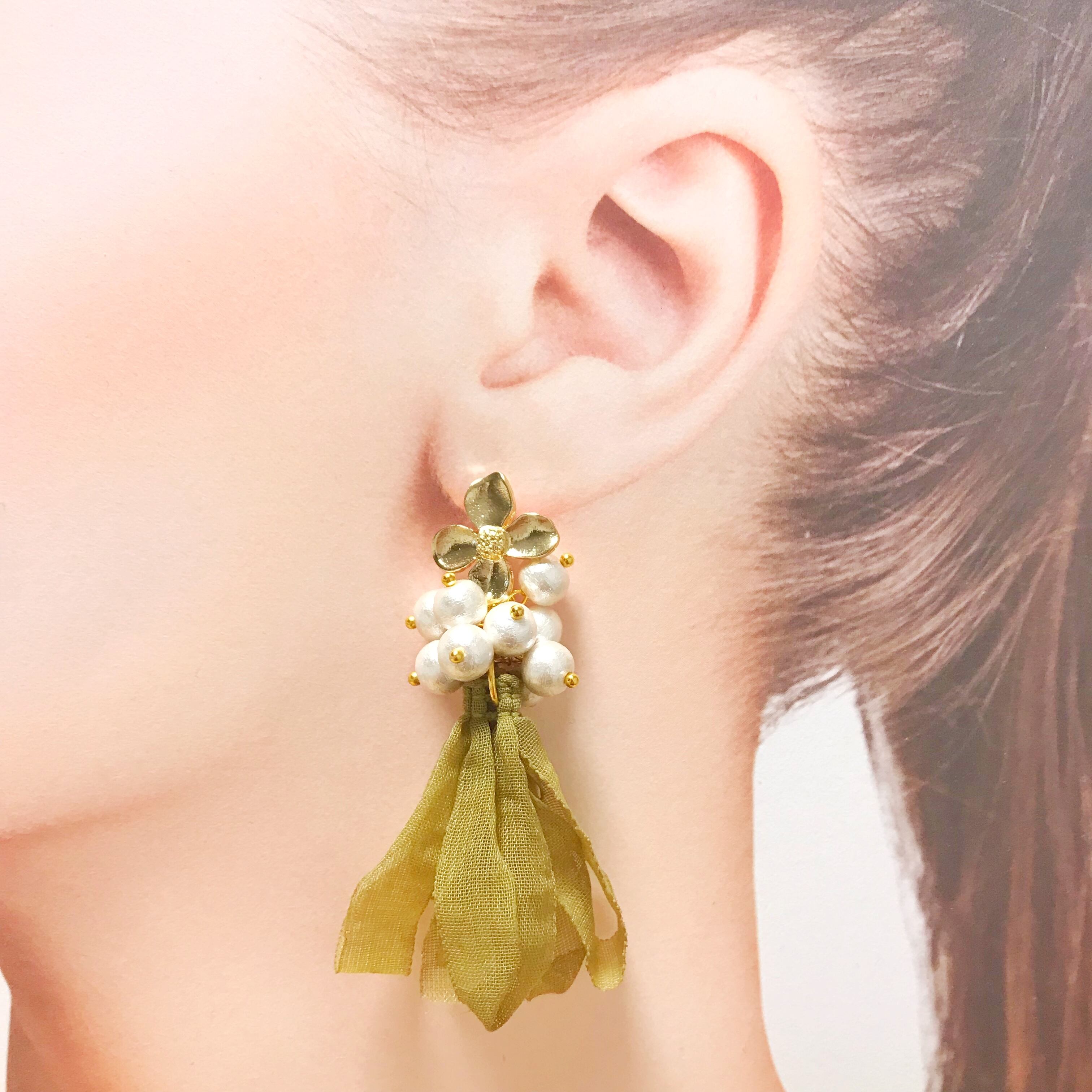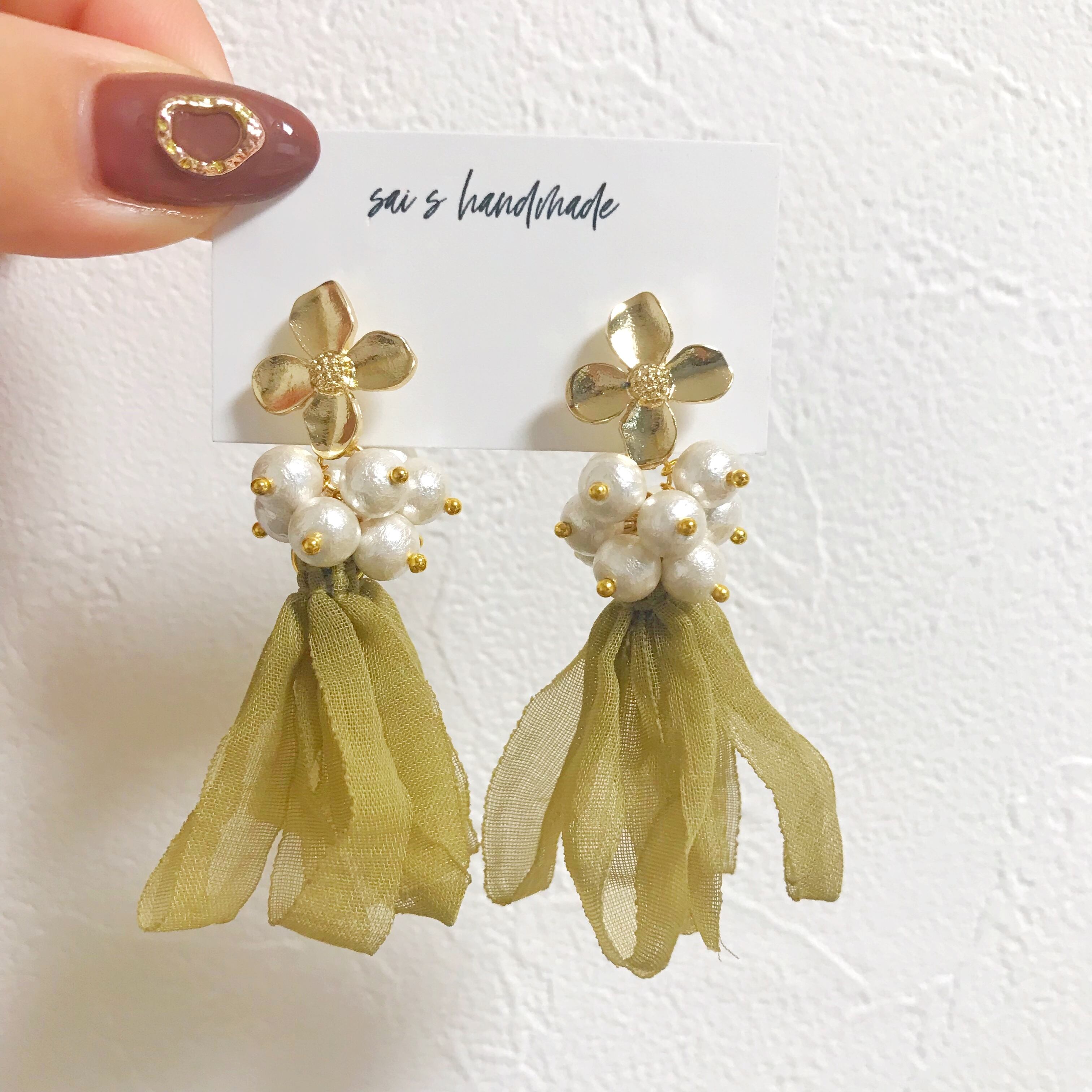 フラワーのデザインポストピアスに、コットンパール、シフォンタッセルを合わせました⌄̈⃝❤︎
