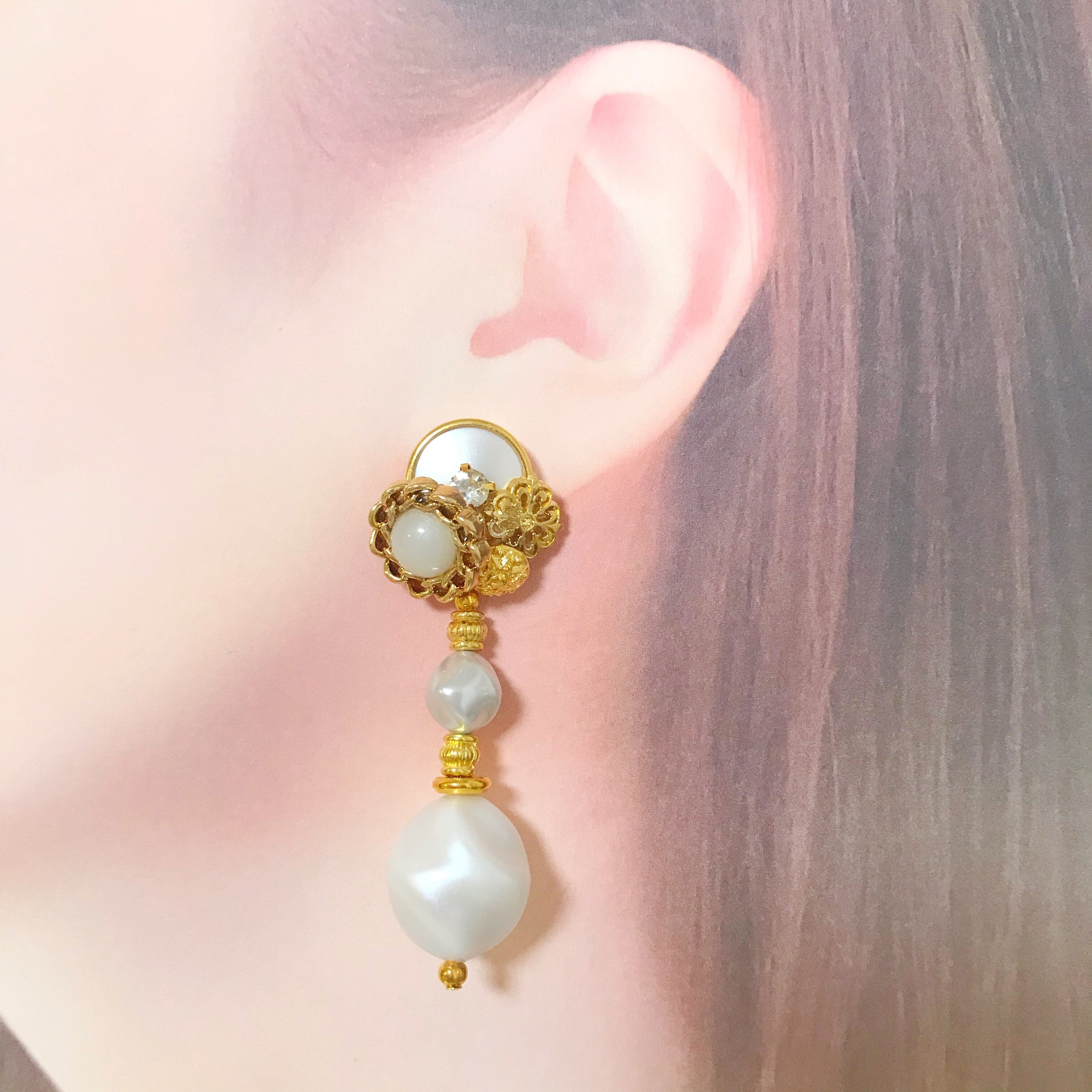 ホワイト系重ねボタン × ひねりビーズpierce/earring:*:・