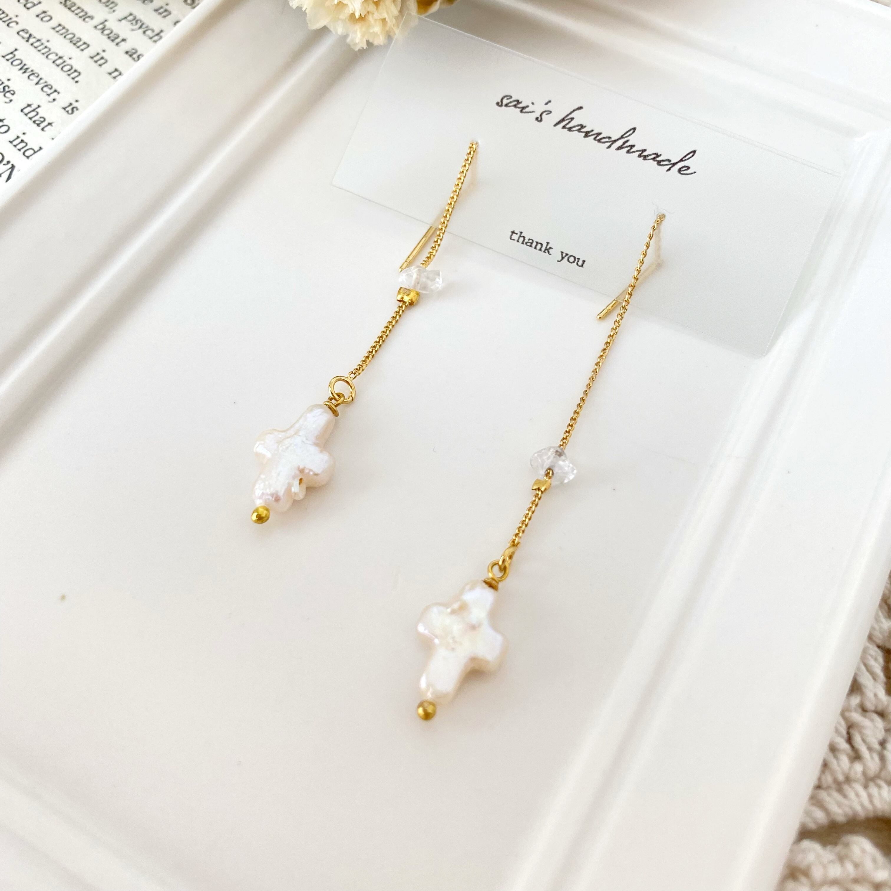 十字架の形がかわいい淡水パールのチェーンピアスです( ⁎ᵕᴗᵕ⁎ )